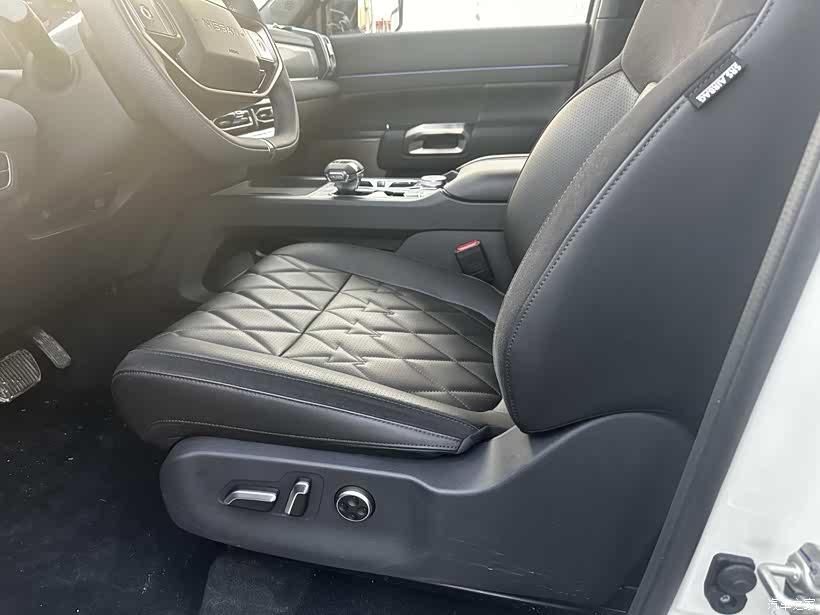 布局是熟悉的中控屏外加仪表屏,一大一小,算是新能源车的经典简约风格,只是没想到有一天能在燃油车,还是辆皮卡上见到。这个中控屏也不是装饰,流畅度相当不错,至少在我体验过的合资车里,算是拔尖的水平了,而且尺寸也不小,显示的东西很多还很清晰。中控屏下面还保留了一排实体按键,用来快捷调节空调还玻璃加热除雾等功能,这点好评。