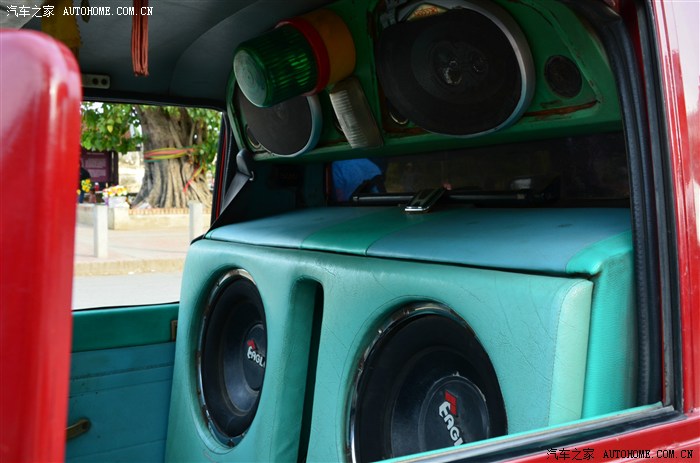 看见车座靠背蓝色的了吗?那个是大扬声器