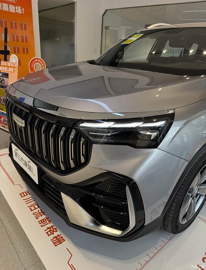 陪朋友去吉利4s店看车,他琢磨着买辆家用SUV,我就跟着试了把豪越L。说实话,之前网上看图觉得这车方头方脑的,实车看着倒挺大气,车头那个格栅面积是真不小。
