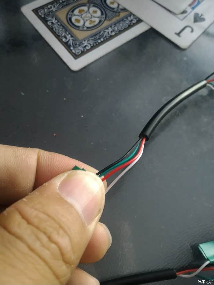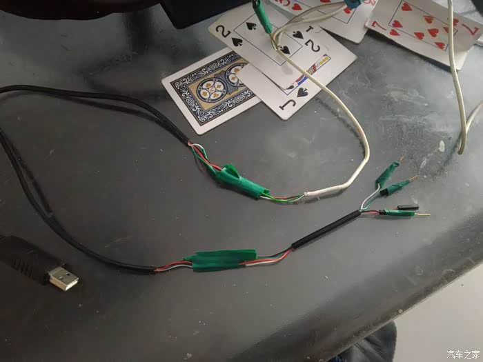 1、数据线制作,网购的pl2303数据线比较短不够用,找了三条废弃的数据线拼接在一起。手机数据线里面是四根芯线,颜色分别是黑、绿、白、红,我们需要用的只有三根,除了红线,那么就用黑、绿、白。接线的时候注意,把买来的PL2303从中间剪短,中间部分用手机数据线连接,同种颜色接同种颜色,红色的不接 也用不上,铜丝直接插进褐色接口里,那么接好之后就是下图的样子。