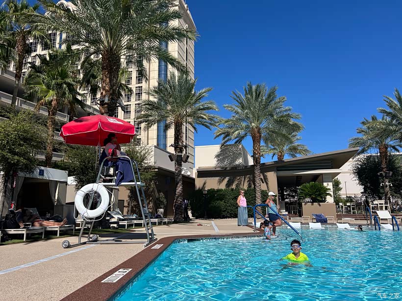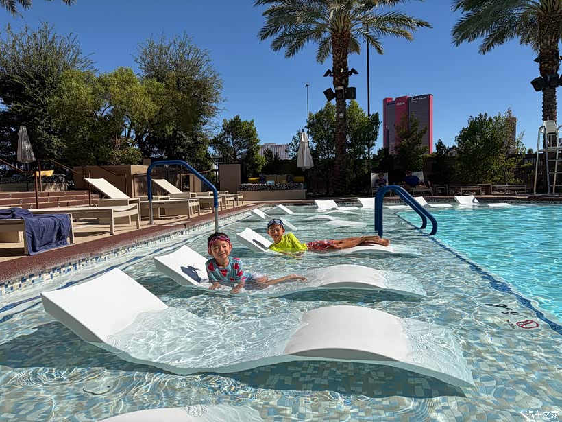 这次我们住的宾馆是Palace Station,也是拉斯维加斯的相对比较小的,有历史的大酒店。拉斯维加斯白天有三十度左右还是比较热的。酒店里面的游泳池也是孩子娱乐的好地方。顺便我也躺着睡个午觉。