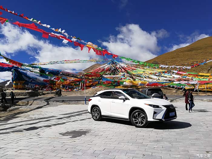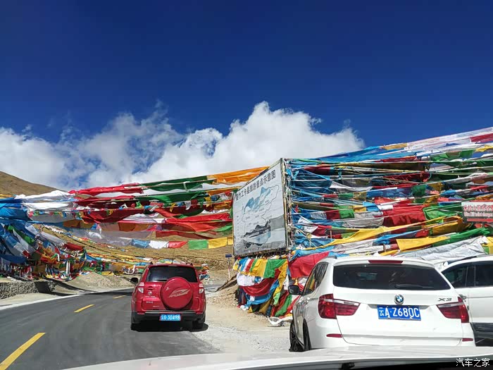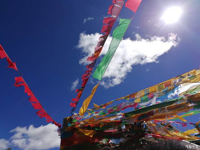 米拉山海拔5013米,蓝天白云下五彩经幡在大地与苍穹之间飘荡,连天接地,将人们虔诚的愿望传达上苍。。。