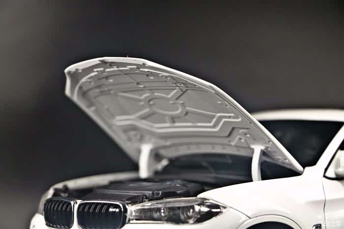 模型的引擎做工方面只能说表现一般,全塑料的材质,质感一般,带有“BMW,M”等车型标识,可惜的是引擎盖并没有配备液压支撑杆,依然是冷冰冰的狗腿。