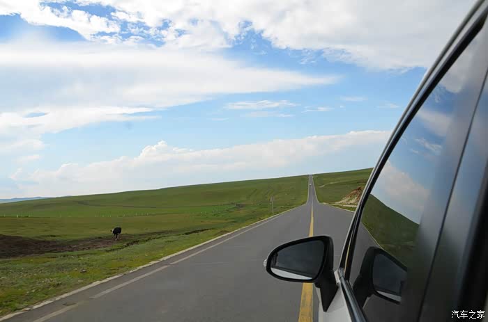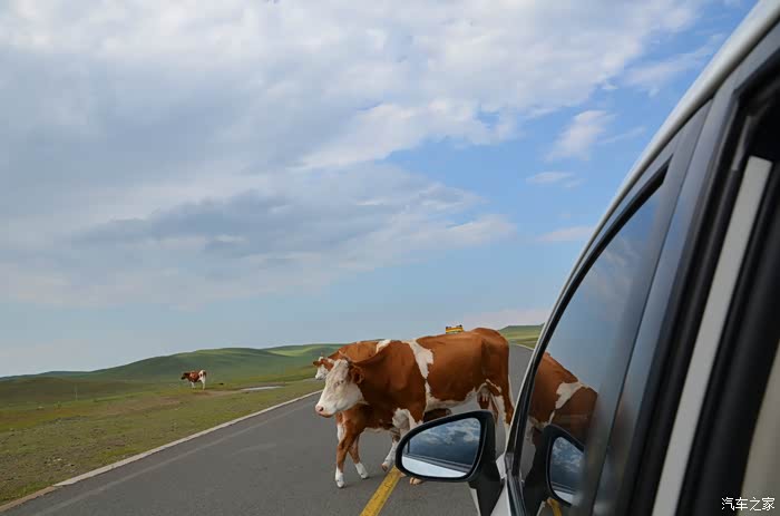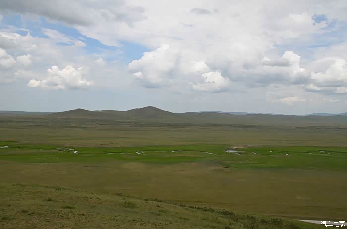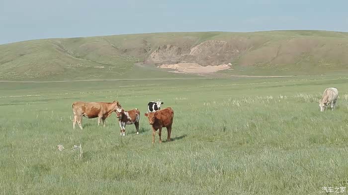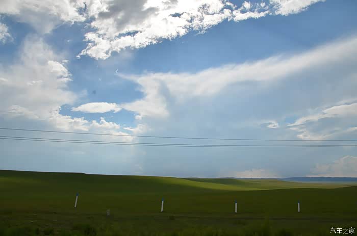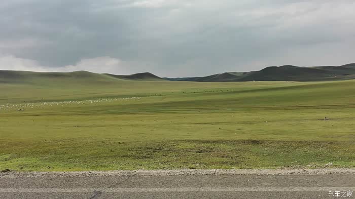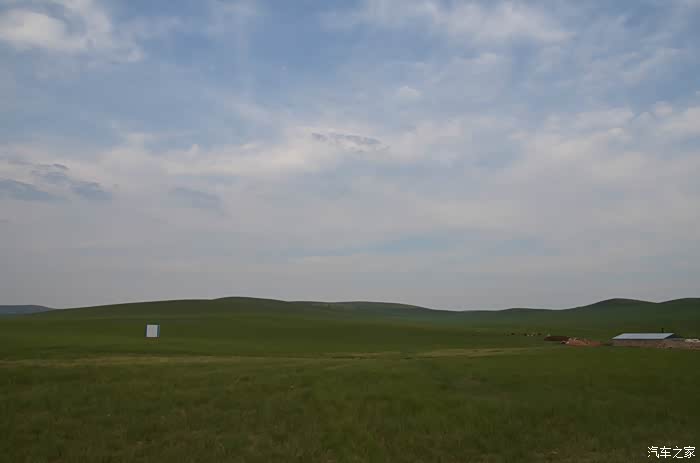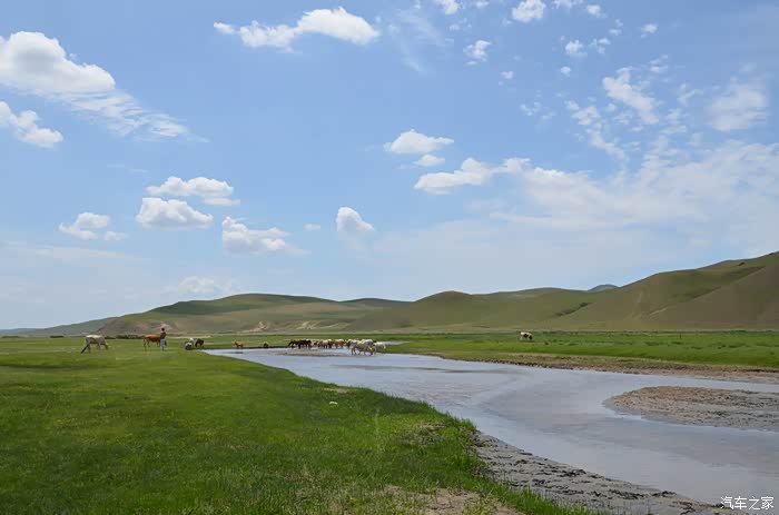 S307两边的草长得很好,像绿毯一样铺在大地上,不时有起伏的小山包,形成了一个个Windows桌面。云的影子投射在绿地上,草场上散布着悠闲的牛儿、羊儿、马儿。此情此景,令人心旷神怡,随着车中播放的蒙古抒情音乐,大家的心情好到极致。