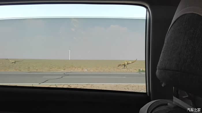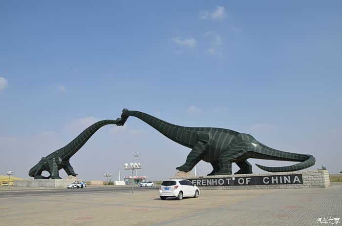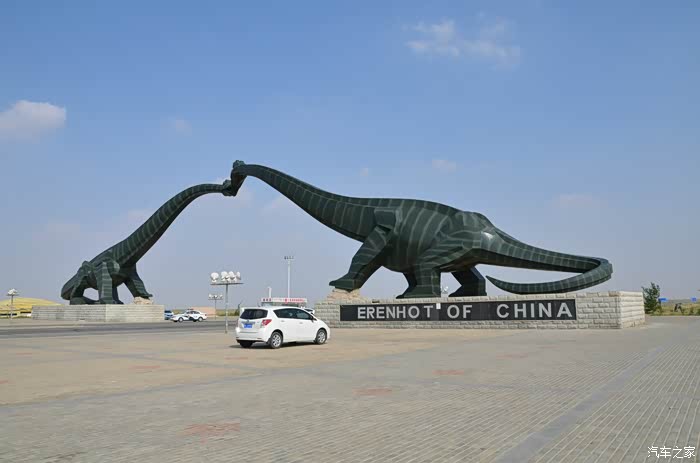 国门出来,在车上解决午餐,到二连浩特市的市门处停留片刻,这里有两只体型巨大的恐龙模型,横跨道路上方形成一个拱形门状。道路两边还有不少恐龙雕塑。