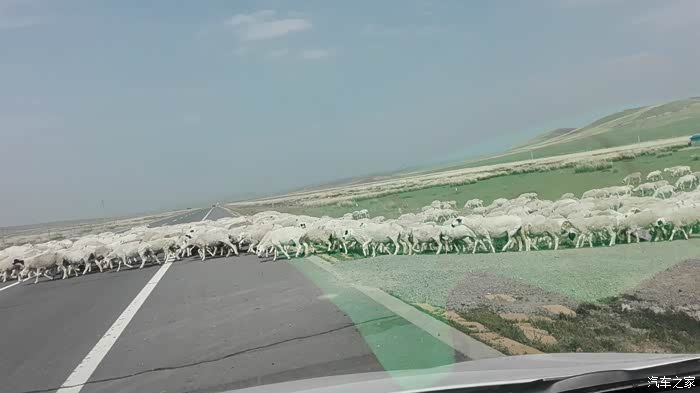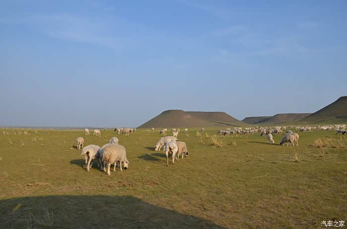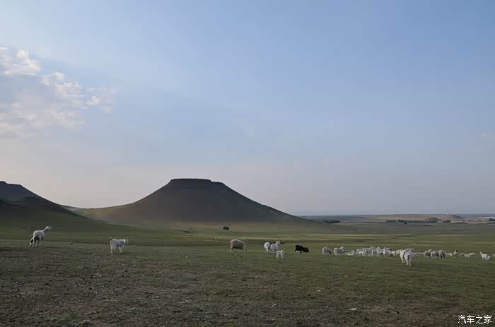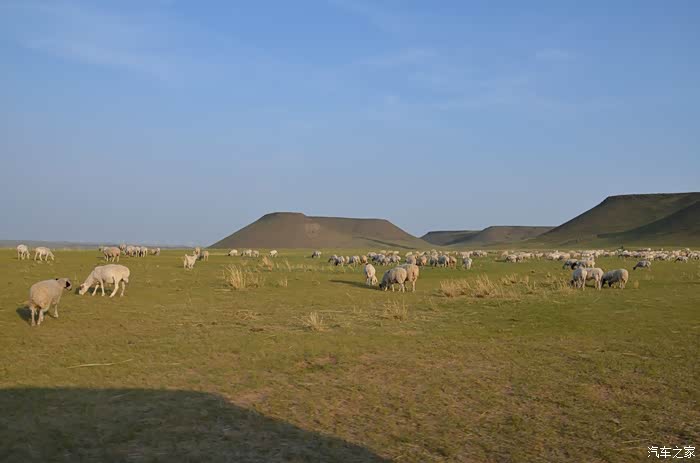 第二天。旅馆养的两只狗半夜就开始叫,一夜没睡好。起床洗漱,收拾行李,早早出发继续行程。从张北进入内蒙后,沿途的景色立刻有了不同,视野开阔了,出现了满眼的绿色,羊儿、牛儿、马儿成群地出现在道路两边,悠闲地吃着草儿。 大家不时发出惊叹 声, 心情顿时好到不要不要的! 到宝昌南下了锡张高速,寻找早餐,并到当地超市补充蔬菜、水果。为了能够随时停车观赏沿途景色 ,我们沿207国道走了一段。