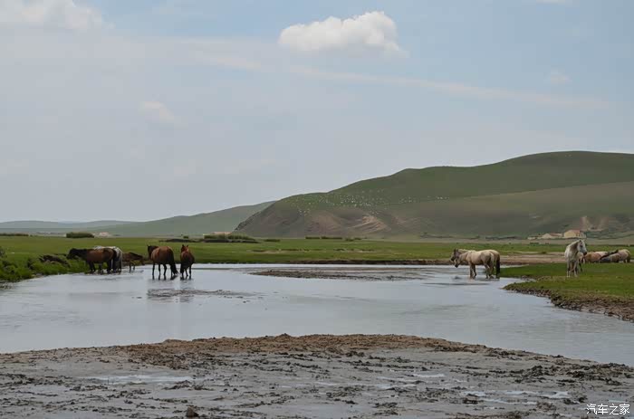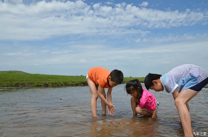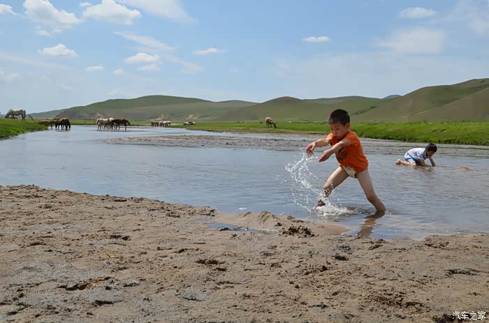 进去随便逛了逛,一番摆拍后,离开朝蒙古汗城对面的小路驶去,就是前往迪彦林场的方向。不宽的一条小路,路过河边的一处牧民家,看到河水清澈,就将车弄到牧民家停车场,带孩子们下河玩儿,河水很浅,很清。在这里玩了2个多小时,要不是想到半拉山附近露营,真得应该在这里多待会儿。弯弯曲曲的河水,成群的马儿在河里饮水,头顶是碧蓝的天空,朵朵白云在天上飘浮,云在天空不断变幻,投下的影子在草原上闲庭信步,远处的丘陵披上了绿装,牛、羊似粒粒珍珠撒落在青山绿水间。除了太阳光太晒外,一切都那么惬意。孩子们真得玩儿嗨了,全都湿身了。要走时,喊都喊不出来。
