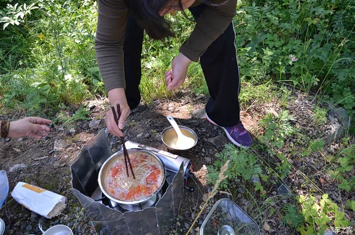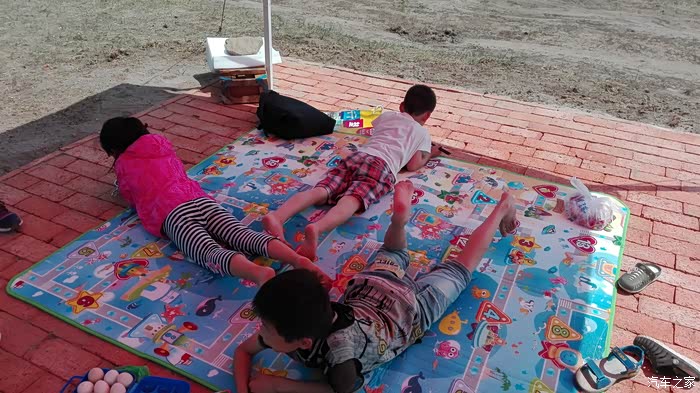 锡张高速穿越浑善达克沙地 我们也不赶时间,看到路边一处牧民人家 ,便驶下休息,拿出地席,支起炉子,午餐还没吃呢,有点儿饿了。西红柿鸡蛋面,孩子们吃得可带劲儿了。