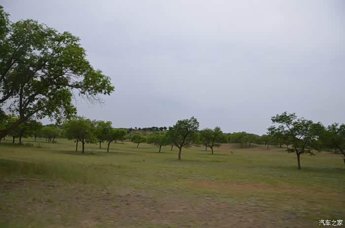继续前行,看不到河流了,其间有段公路在修路,驶入临时开辟的工程车辆通行的小路,由于路基是沙地,加上大上车的碾压,路上两条深深的车辙,中间是高高隆起沙地,我就在这样的道路上小心地选择、避让,一路小心翼翼往前蜗行,不时还要与对面驶过来的工程卡车会车,还要时刻提防不要托底。好在这段路不长,几公里吧。等终于重新驶回柏油路时,悬着的心才放下来。这条大峡谷真是静谧,路两边不时出现平坦的沙地,三三两两的榆树随意地长在沙地和草原上。很有意境。