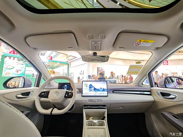 整个驾驶舱浅色内饰搭配的非常干净利落,没有复杂的线条,看着让人很舒服,车顶的天窗区域也都有实体按键