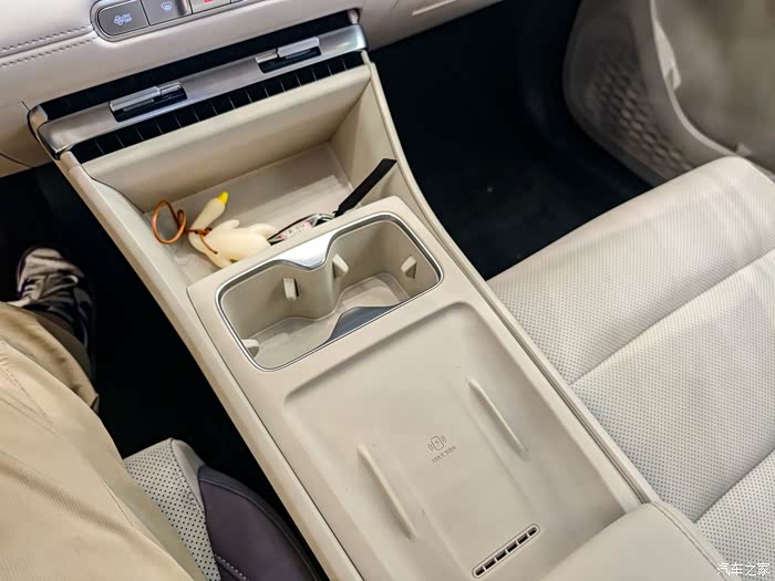 前文提到,怀档设计让名爵MG4的中央岛有了更大的空间,双杯座+储物盒很实用,另外还有风冷手机无线充电