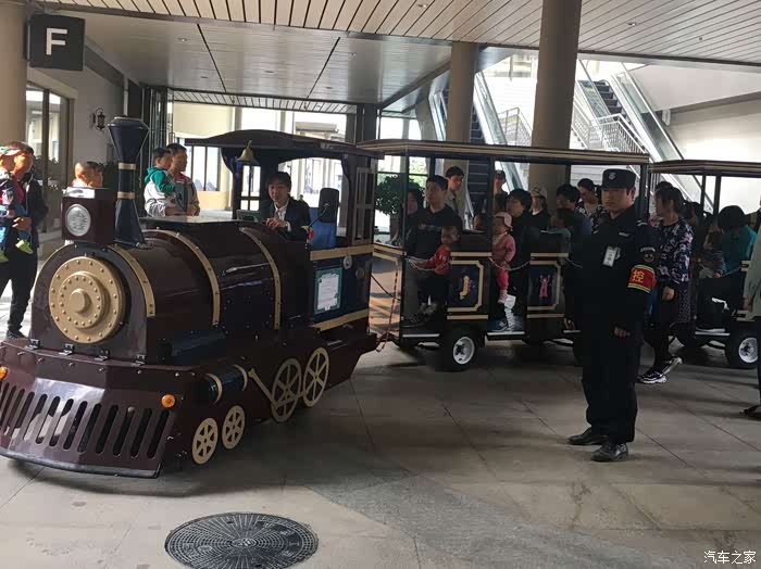 无轨小火车深受小朋友们的喜爱,孩子们坐在里面有说有笑。