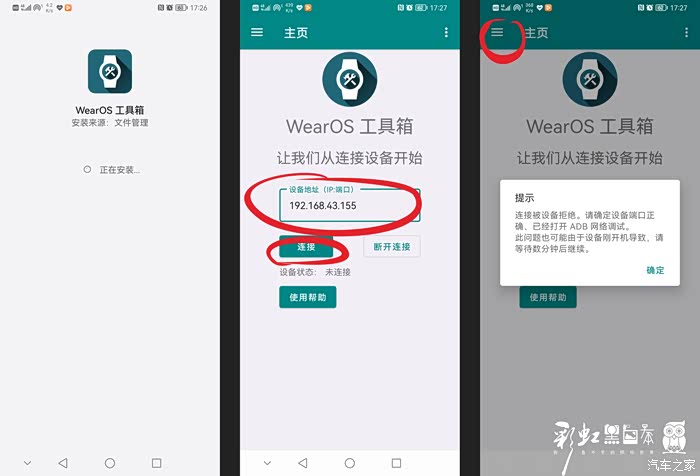 如果弹出一个提示“连接设备被拒绝”,则需要在车机端重新把那个“USB调试”和“Wifi Adb debugging”关闭再打开,再次在手机上 Wear OS 工具箱 里点连接,就可以连接成功了。