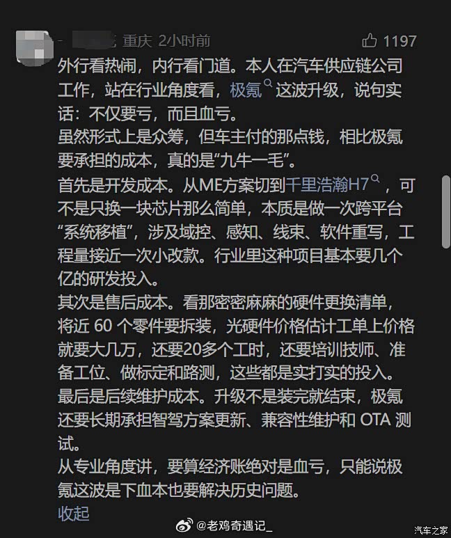 我只是一个小小的24款车主,也不是什么有钱人,只希望自己的车能开个十年八年的,当然现在的汽车博主会告诉我:新能源是电子产品难免两三年就要换车。而在现在这个不好挣钱的大环境下,普通老百姓谁能开四五年就很随意的在掏10万换车呢?我是已经众筹的24款车主了,肯定也会有人喷我说:极氪吹的牛逼为什么要花自己的钱去圆呢?我会回答你:那我能怎么办?现在的24款能换智驾也是当初那批去维权的人争取下来的,要么我就不换智驾,彻底告别智能化,而我又想以最小的代价来享受科技,这就是我的最优办法,虽然有点贵,但比我一次拿出十万换车要划得来。
