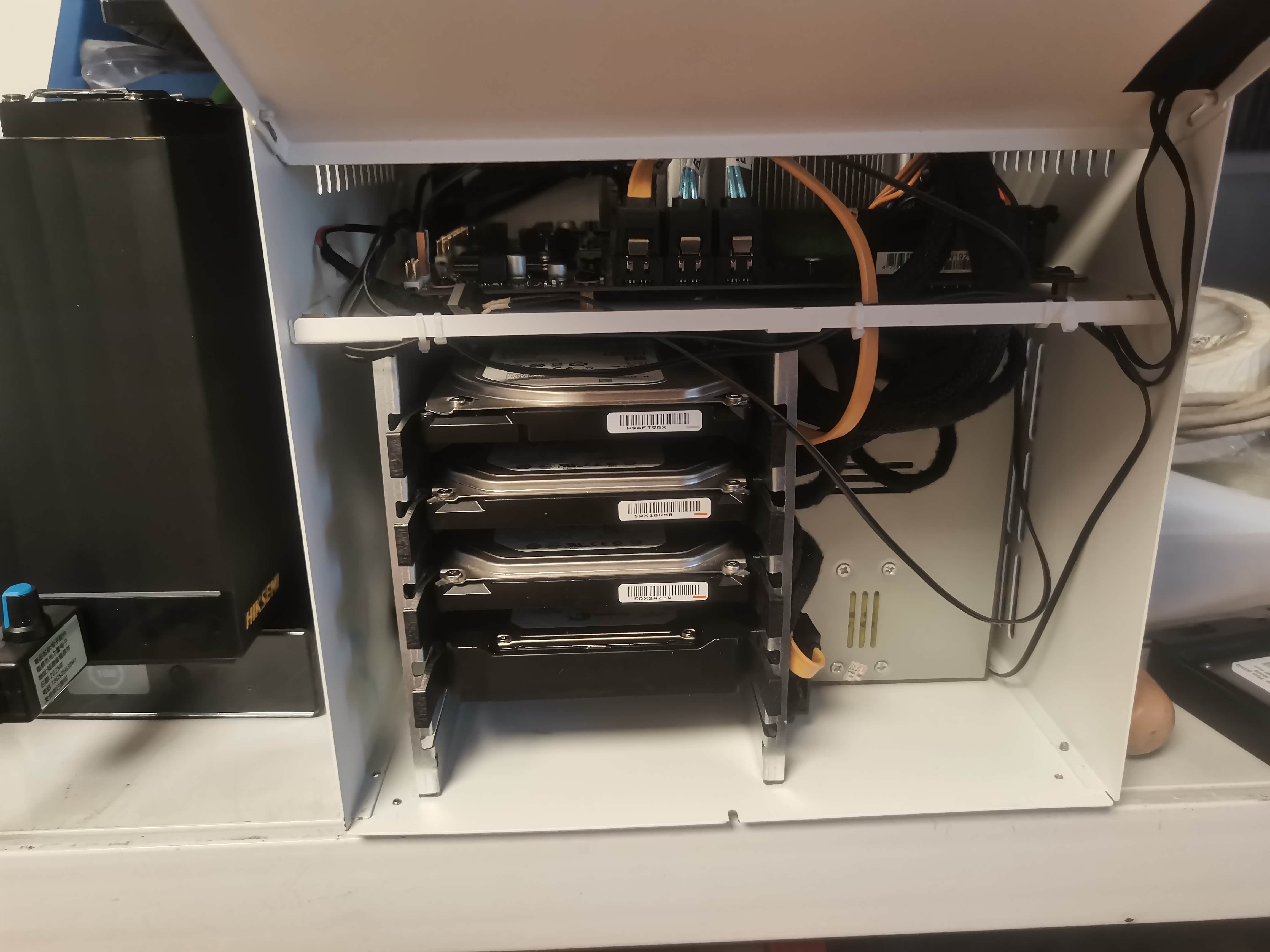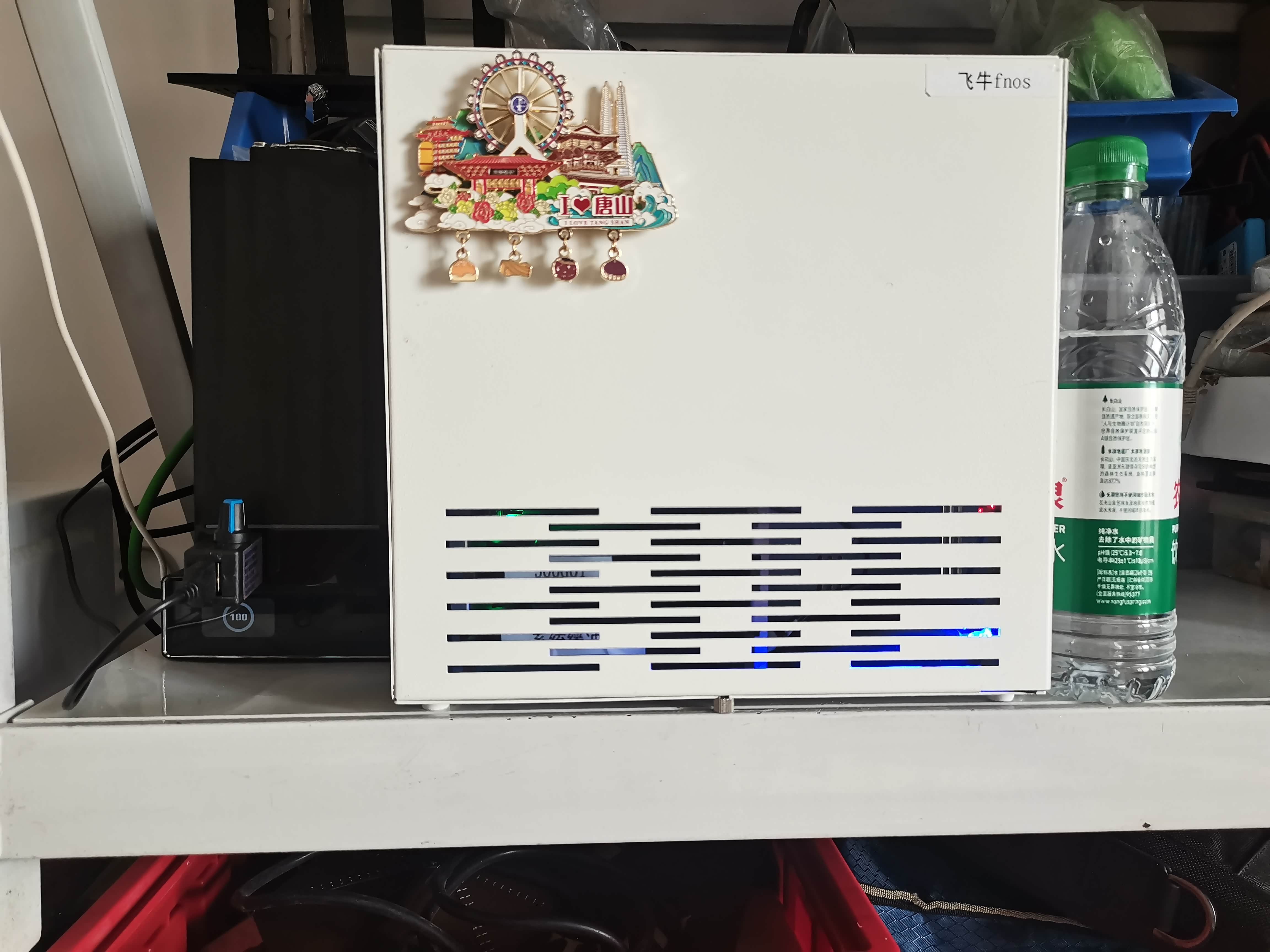 最左边的是海康mage20pro、右边为纯手搓NAS、在旁边是纯净水瓶子。
