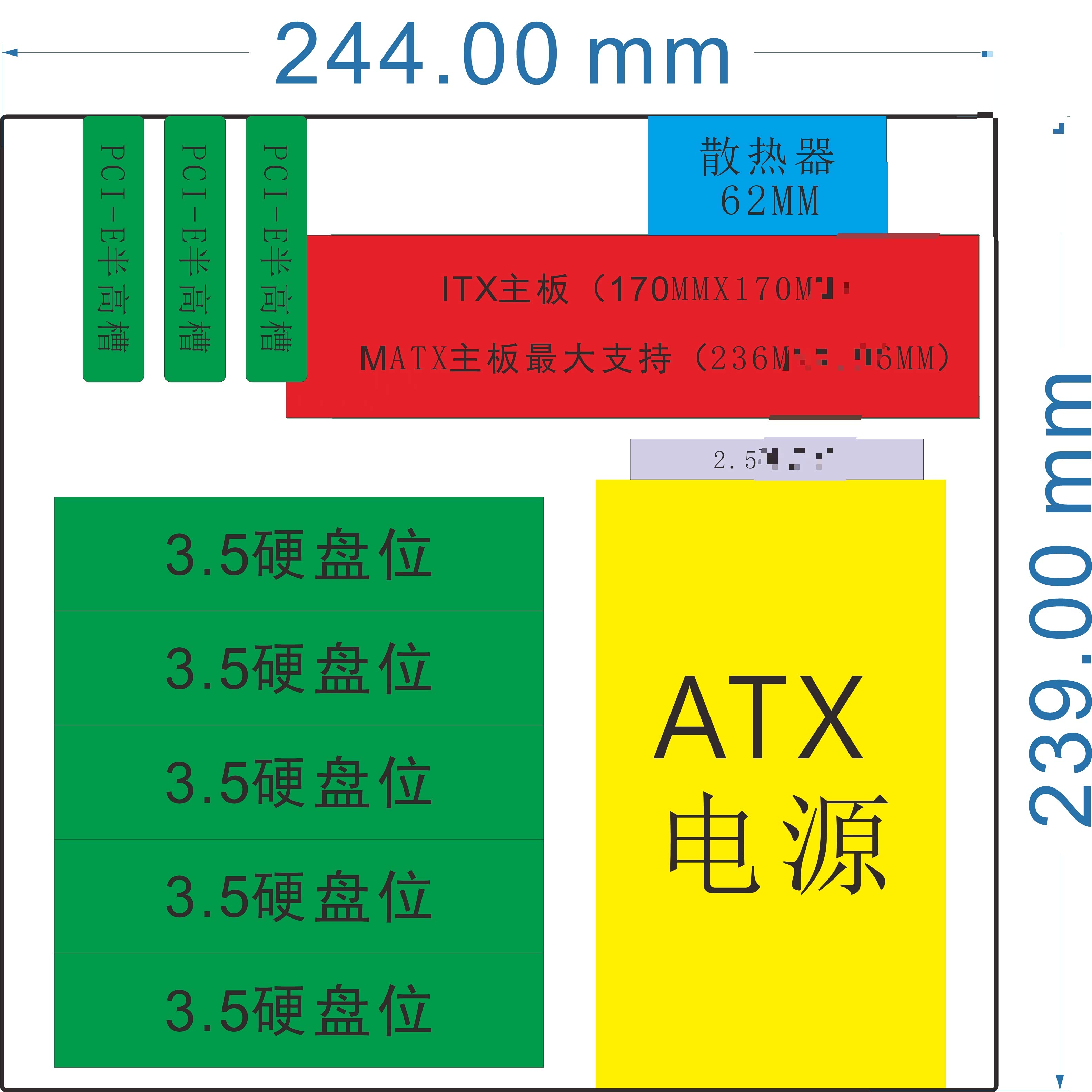 机箱布局图 硬盘仓可以安装五块3.5硬盘 ATX电源位置可以安装一块2.5固态