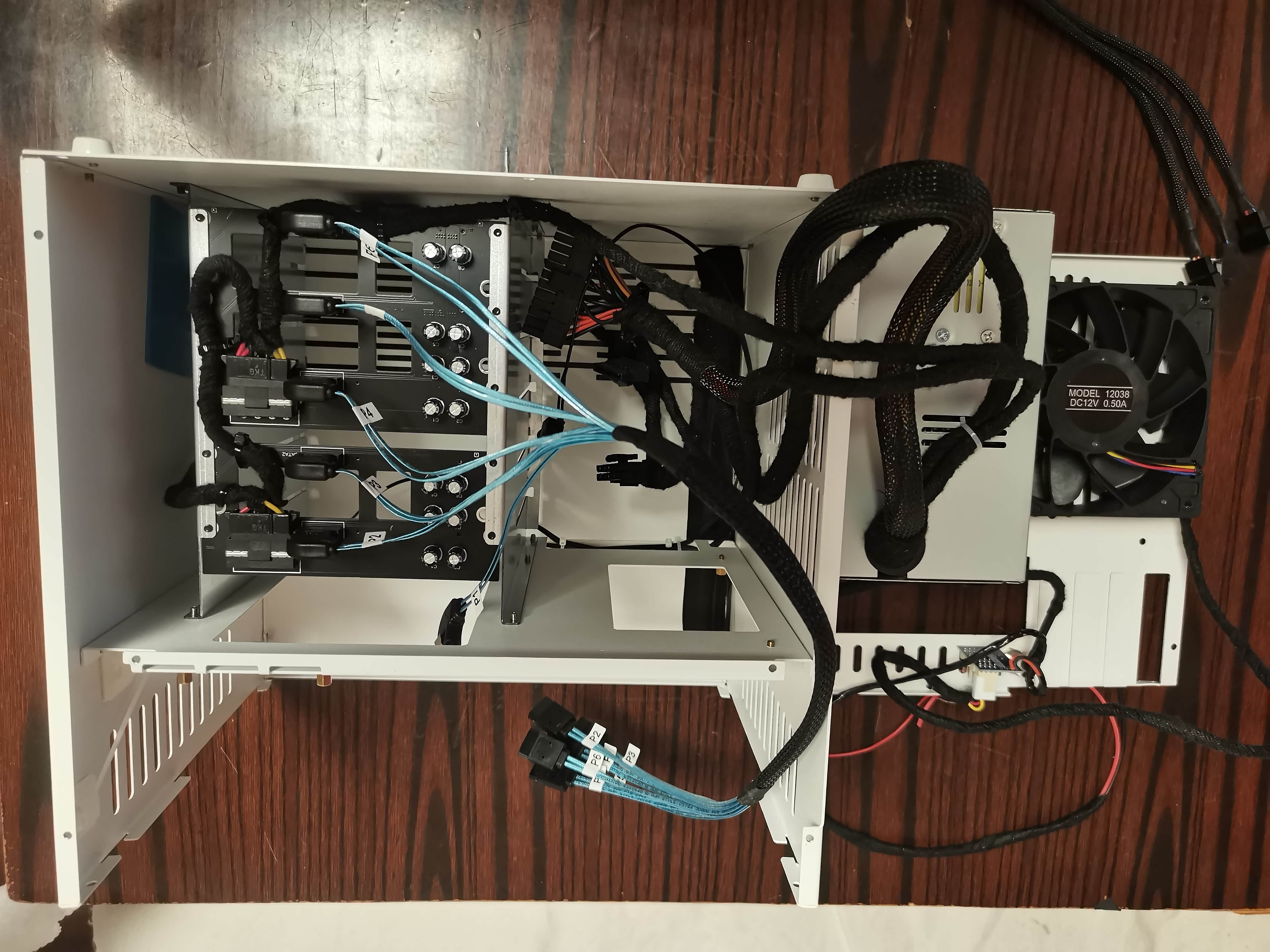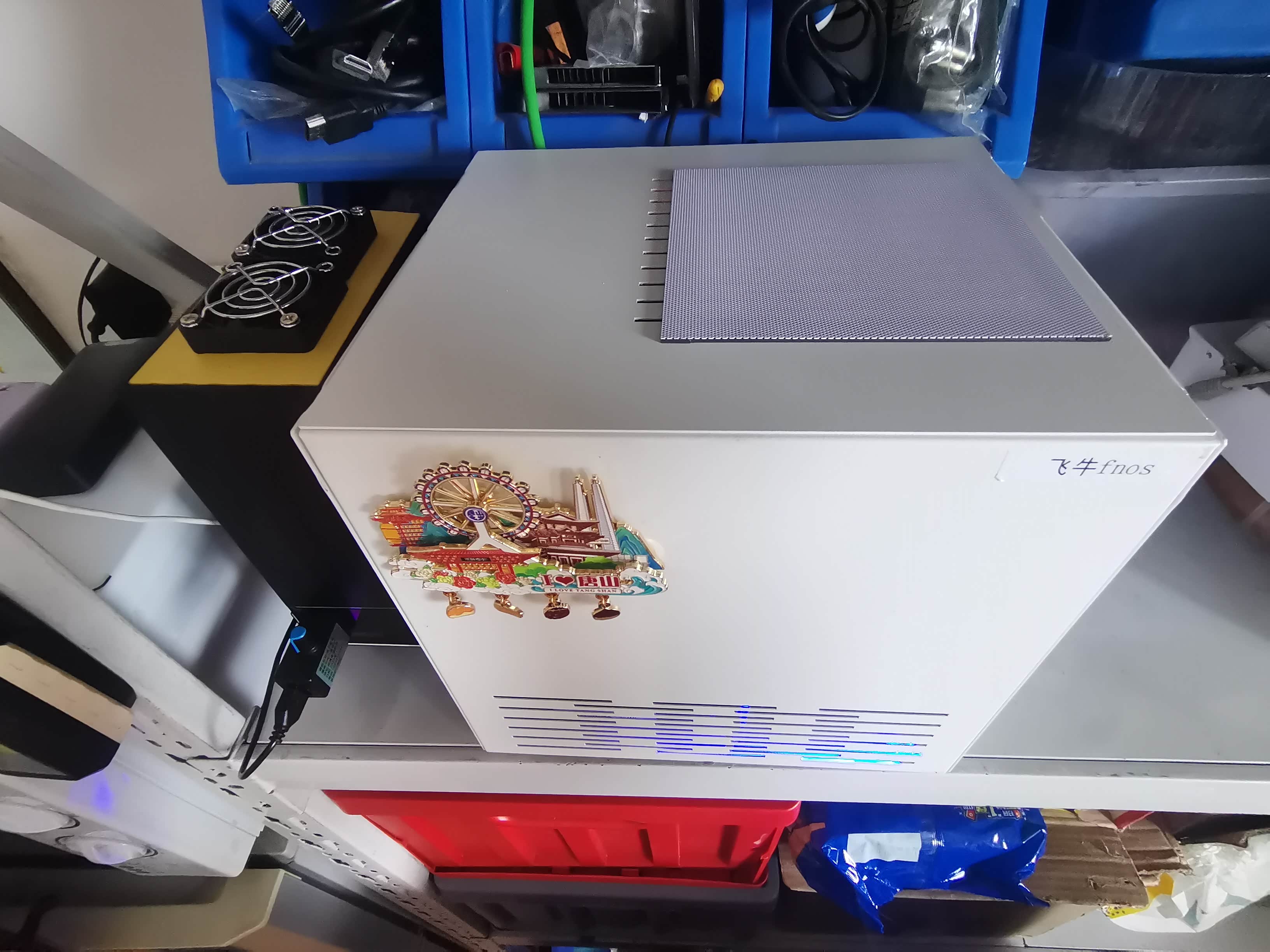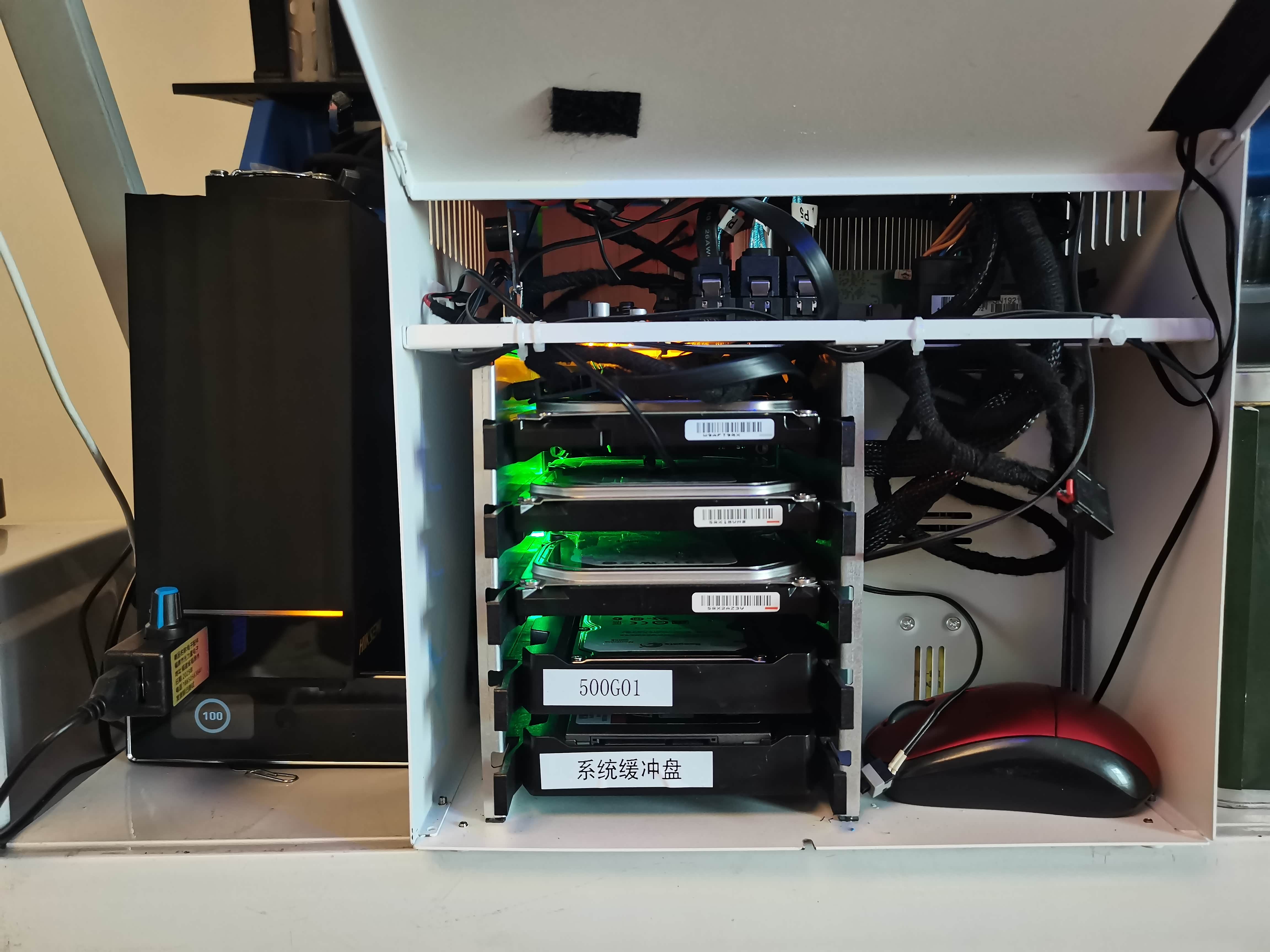 五块机械硬盘为存储、一块金士顿256G固态硬盘为飞牛系统盘。外加一块128G固态win7系统盘。