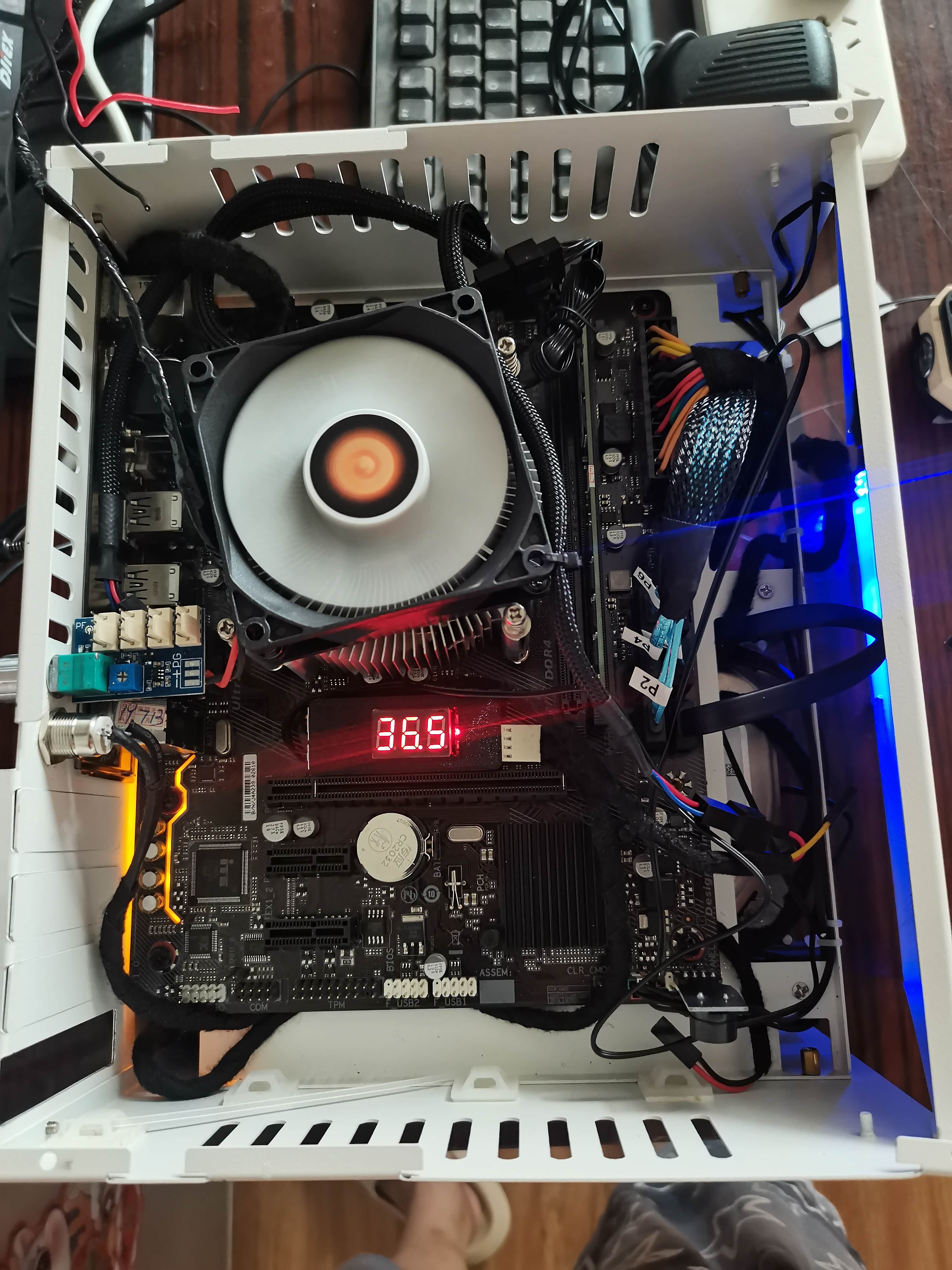 安装固定主板、在把温度控制模块固定好,目前设定硬盘仓超过45度自动开启风扇转速调为800转,低于35度自动关闭风扇。800转左右 几乎处于静音。