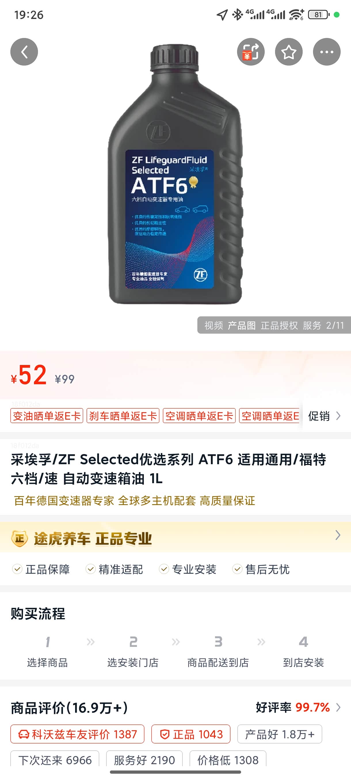 1.0t 昨天第一次换 73500 公里,循环机更换,采埃孚 12 瓶,558 块。也是途虎