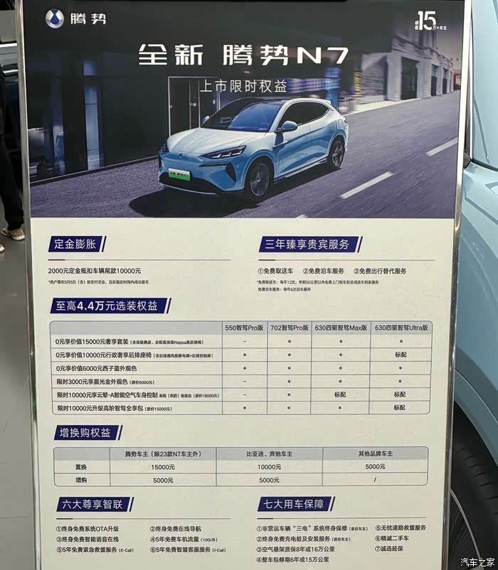 总结:从价格到配置,从外观设计到空间,全新的腾势N7都给人满满的诚意。体验后,我也了解了下购车政策:2000元定金抵扣尾款1w;腾势车主(除23款外)增购减5000,置换减1.5w;比亚迪、奔驰车主增购减5000,置换减1w。还有终身OTA免费升级、智能语音,在线导航等;5年免费的车机流量、智慧客服、紧急救援服务;3年的免费取送车、泊车、出行替代服务。