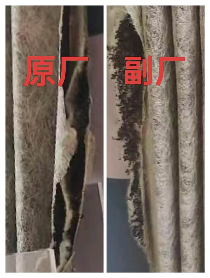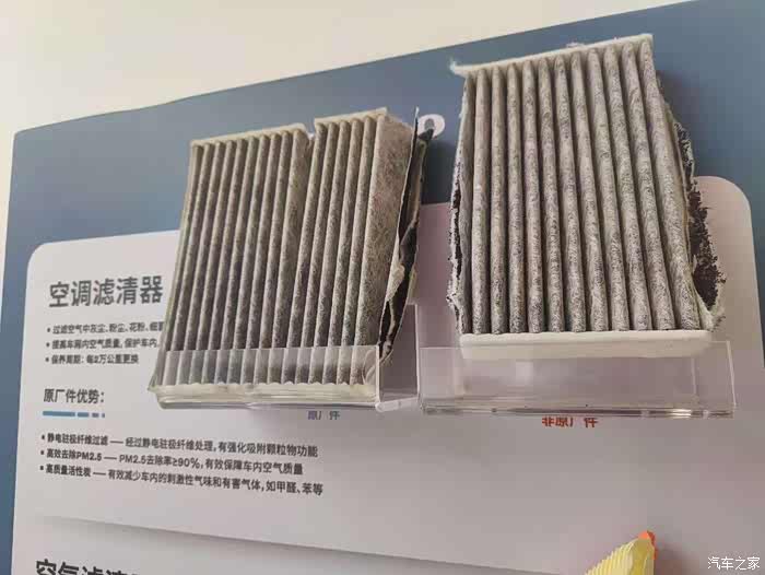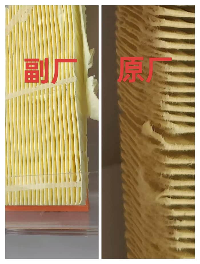 空气滤芯,在材质上原厂滤芯比副厂滤芯纤维要多,更容易吸附空气中的尘埃颗粒,在内部结构上,贴敷的活性炭颗粒也要多得多。