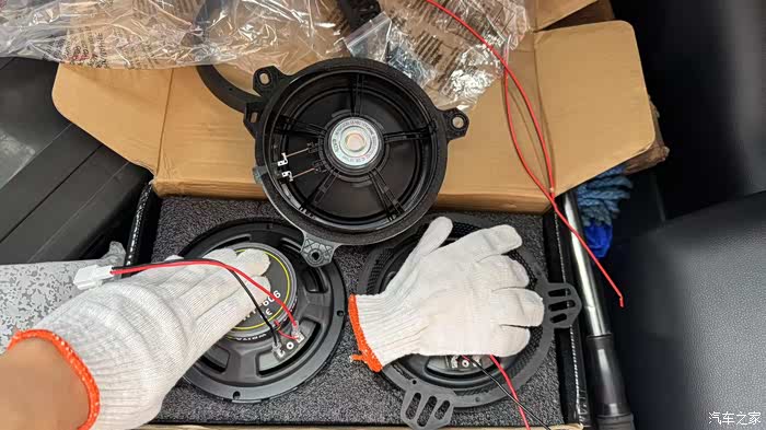 5,前门两个喇叭,旁边有个椭圆空,用胶皮封着,刚好可以穿喇叭线,后门开口较多,不需要单独找穿线位置
