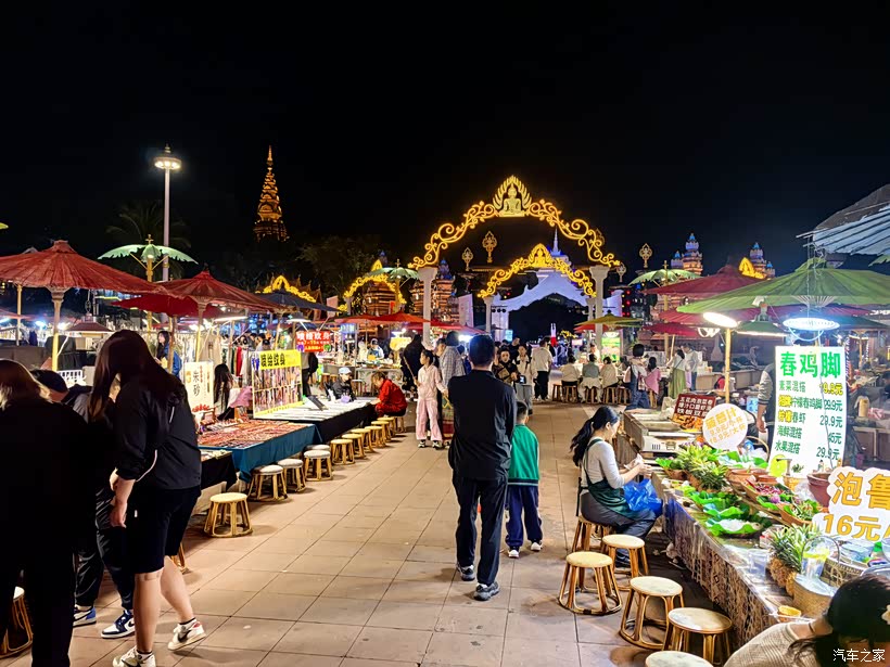 告别植物园,驱车前往星光夜市,夜市里灯火璀璨,傣味烧烤、包烧金针菇、香茅草烤鸡等美食香气四溢。