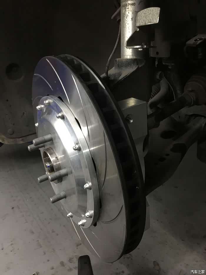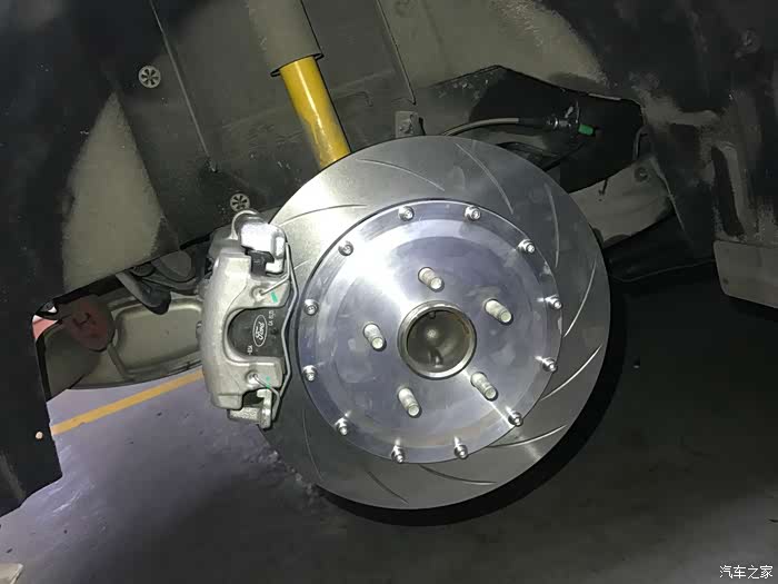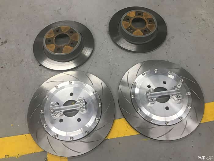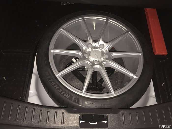 (22)后轮刹车盘加大+更换油管钢喉+EBC红皮 / 这个属于后期添加项目,原厂后刹车盘因为成本问题做成了265mm和普通胶管,不仅效果一般,而且更换了18寸轮毂并且前轮上了AP以后,后轮变得相当空洞突兀并且难看,斟酌了一下,还是跟后刹车油管一起换了,换成324mm分体盘和stopteach的油管,同时补充ATE刹车油,神奇的是新旧刹车盘居然都是4.35公斤。换了之后不仅颜值提升,整个制动更加均衡,点头现象更加轻微,不用更换和改动太多的部件,成本不高,非常值得改进。但是有一条:原厂备胎不能用了,这是大家需要严重考虑的问题。对于我,反正上班代步,后备箱也不常放大件,于是乎,准备入一只和其他四个轮子一模一样的轮子(包括轮毂和轮胎),然后放在后备箱替代原厂备胎,而原厂备胎取出,并且原厂备胎位置考虑上低音炮或者把现有功放从后座靠背转移至此。后来发现原产后刹车片有点拖后腿,于是更换成了EBC红皮;