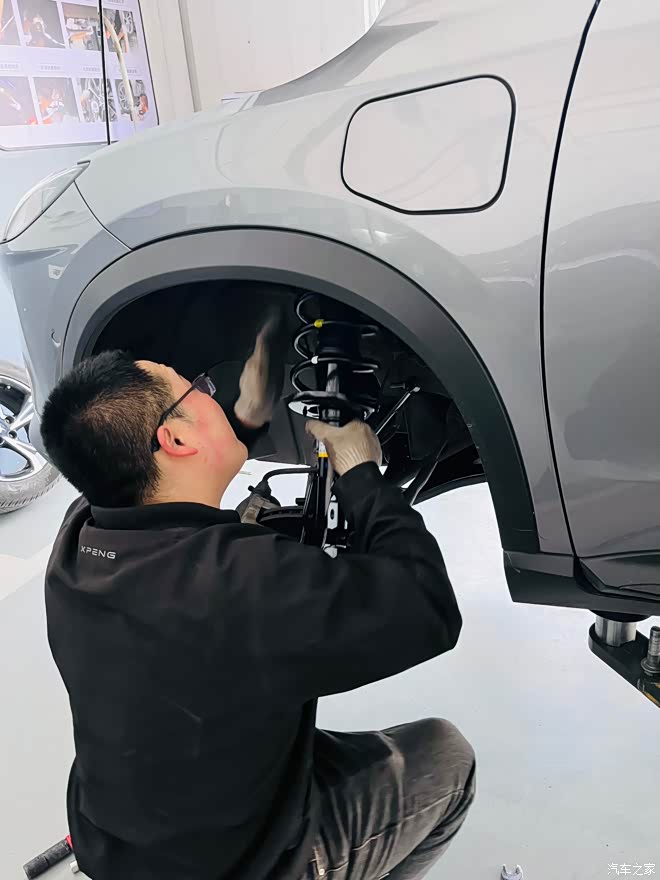 在这次正式保养前,车子没换过任何配件,但最近驾驶时总感觉有些异样。尤其是过坑洼路面时,避震器的弹跳感明显,因贪图省事和价格优势,在4S店以外的店铺更换了四条减震器。可更换完后,驾驶感受却让我大失所望——减震器硬邦邦的,过减速带时震得人难受。更让我揪心的是,在换好减震器的第三天,我在充电站偶遇了同款小鹏G3。一对比才发现,我的车前翼子板轮眉与轮胎的间隙明显更低,用尺子一量,竟比对方低了3厘米!后来经过仔细检查和分析,才明白是在外边更换的避震器,其弹簧承载能力远不如原厂,导致车身出现了明显的向下垮塌。