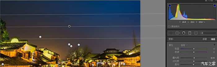乌镇的灯光亮化不错,所以天空在晚上的时候不至于一片死黑,后期LR里针对天空就做了渐变蓝色。