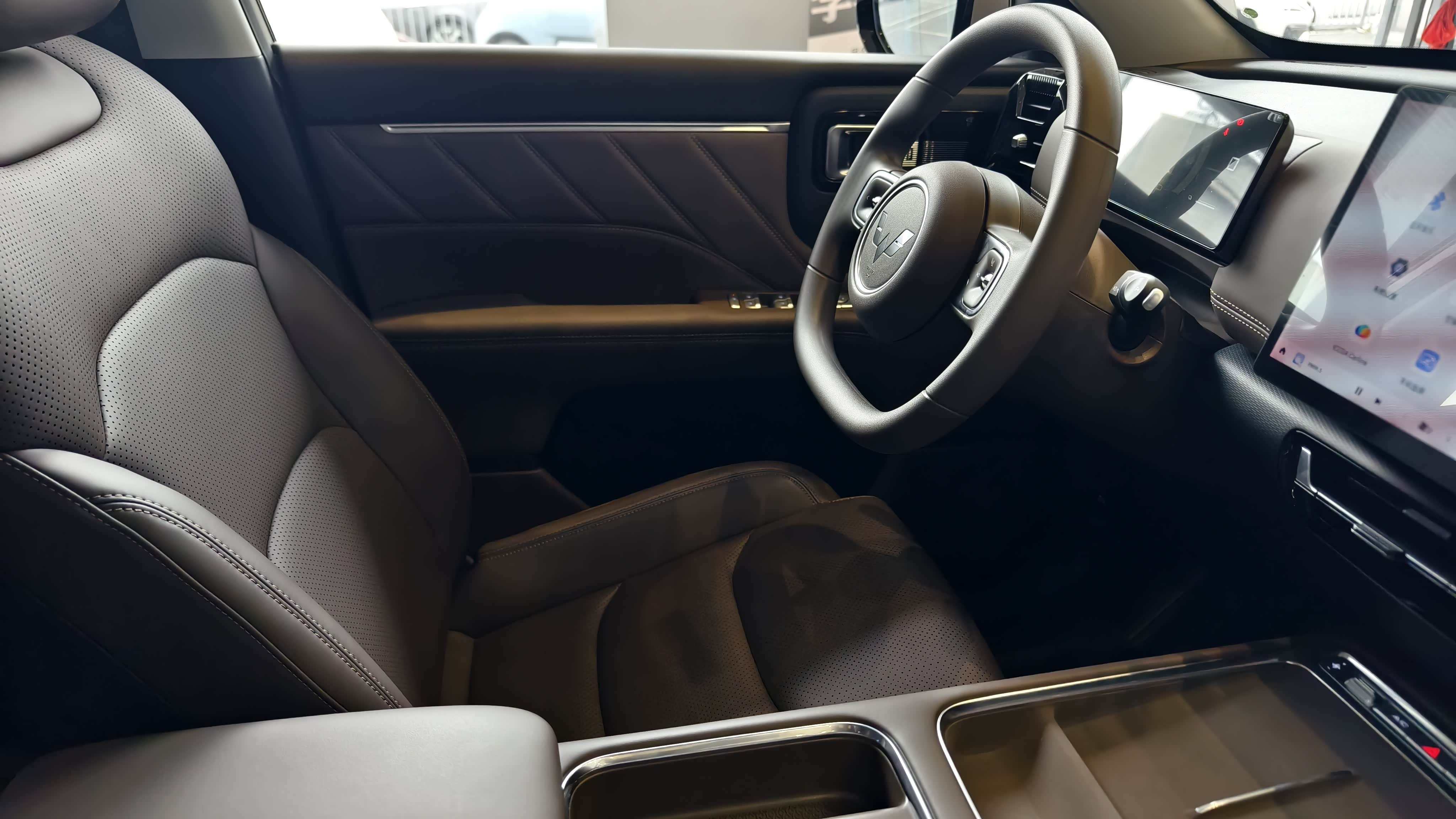 进入车内,设计很简洁。我选的是胡桃棕内饰,氛围挺温馨。虽然中控台上方是硬质材料,但通过双色搭配和纹理处理,并没有很重的廉价感。最让我满意的是保留了大量实体按键,特别是空调控制区。开车时盲操作非常顺手,比在屏幕里翻菜单安全多了。12.8英寸的中控屏反应流畅,支持华为HiCar,导航、音乐无缝连接,完全够用。