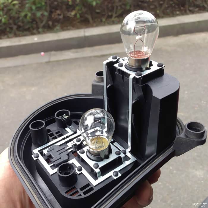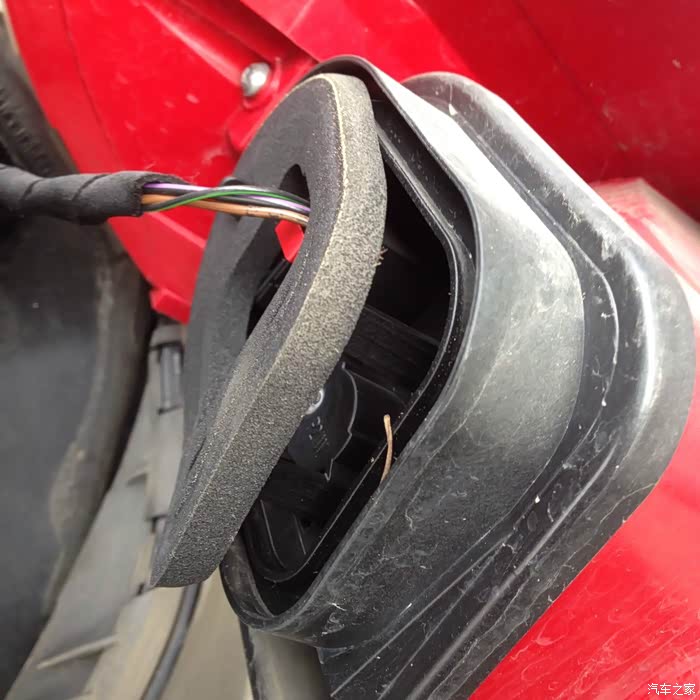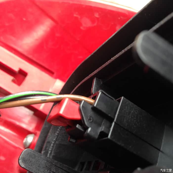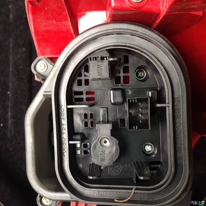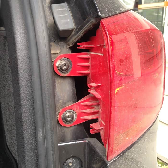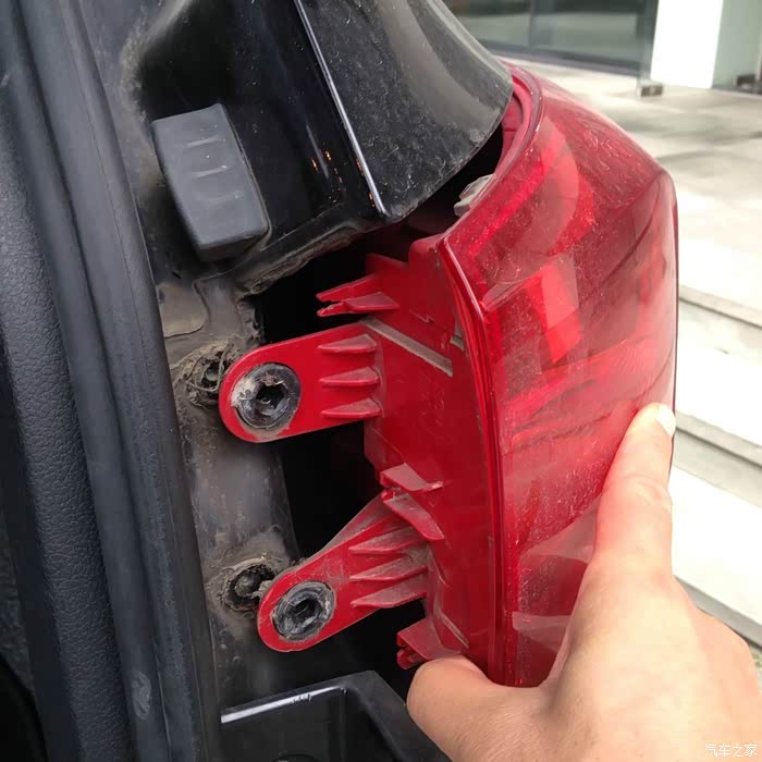 卸下螺丝后,红色灯座松了,但是还拿不下来,需要把整个灯座稍微往外像图所示往外掰一点。然后灯座整个往车后方向就可以拉出来了。