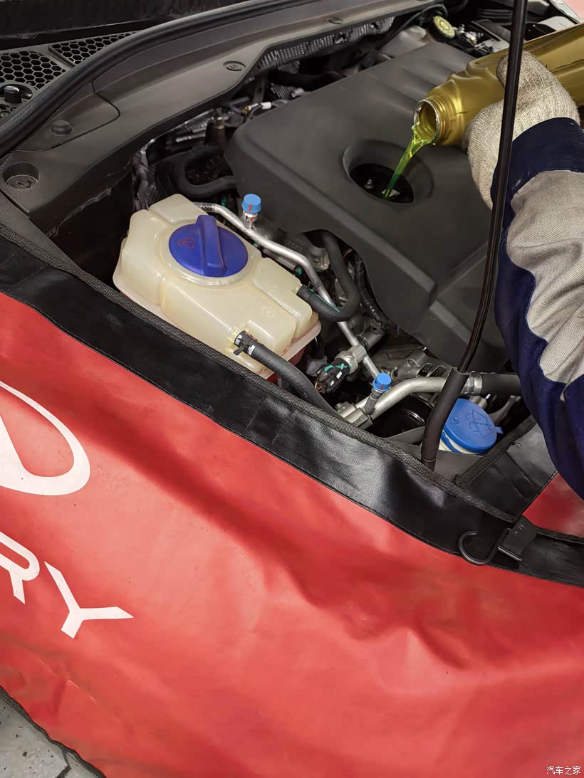等旧油完全排干净,他又麻利地换上了新的机油滤芯,动作快得像变魔术。接下来就是加注新机油的环节,金黄透亮的全合成机油顺着加注管流进发动机舱,师傅一边加一边观察油尺,反复确认油量在“MIN”和“MAX”之间。