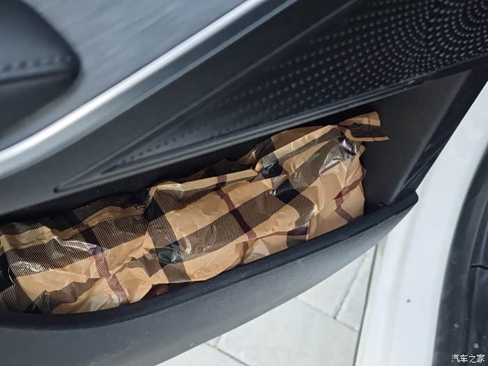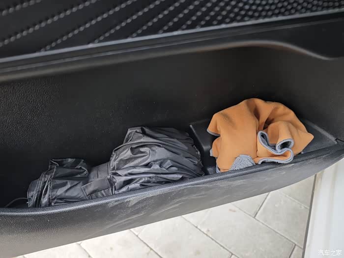 前门左侧储物格我放的是雨伞和毛巾,下雨天这两个会帮到我们,毛斤擦玻璃还是很顺手方便的