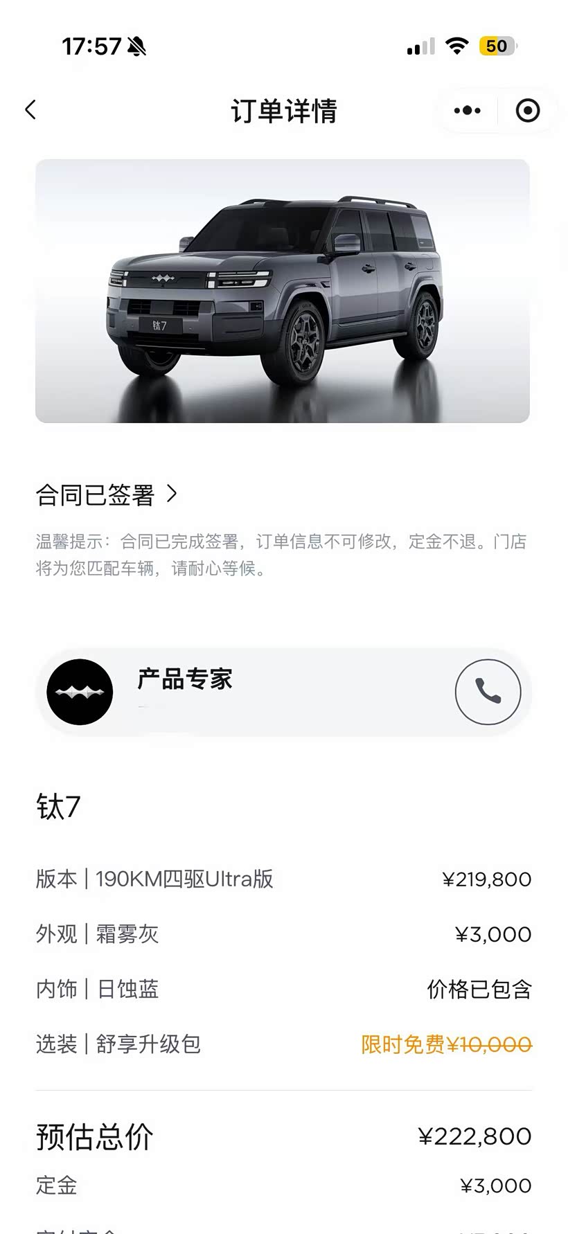 钛7顶配霜雾灰颜色,现车,不用排队等车,在东莞订的,现在等到车,原下单人要取消,需要更名换人买,超好看的灰色,等年前提车免购置税的伙伴聊一下,机不可失,就这两天时间了