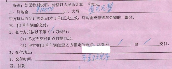 当日,就交订金1W,签了《订购合同》。有必要说一下《订购合同》第三条第3款内容,交付时间:车到现车。就是这个“车到现车”让我陷入了无穷的等待中……。拟购车的朋友请注意哈!