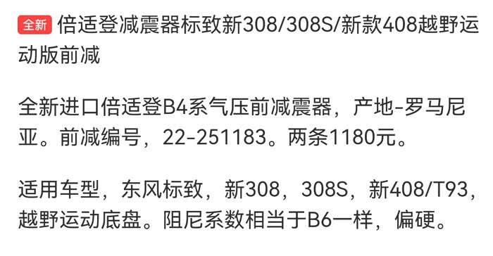 改装初衷:18款标志308服役3年,3万公里了。过坑或减速带自动释放必杀技:真·神龙摆尾,低速起伏或者压井盖路面车身晃动较大,为了解决这个问题,翻308论坛里改装的太少了,大多是308s,408的车主在改装。