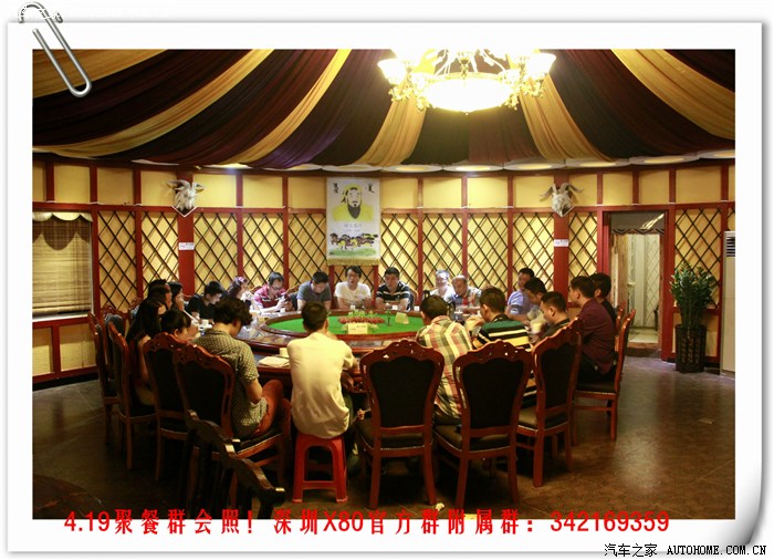 这次活动是九哥提议的地方,是深圳坂田区一个非常不错的吃羊肉的地方,叫蒙古大营,店铺停车场分前后两块大地方,分别停个几十辆车没有一点问题,因为提前预约并告知参加的车辆及人数,所以店铺后面的这块停车场就几乎是给我们留下了,也给我们留了个店里最大的包厢,一张桌子正好坐下所有到场的人员,真是不错!谢谢九哥提供了这么好的场所给群里车友们一次交流的机会!大家到来之后,首先互相认识了一下,因为大家都是买的这个车,这就表明某些方面大家是有共识点的,所以很多没见过面的车友很快就熟络了起来,大家帮着发着贴着汽车之家的车标,帮忙摆好车位,帮忙拉开横幅,帮忙照相,说说笑笑其乐融融!在外照相以后,大家说说笑笑的进入了包厢入座,又开始各自做了自我介绍,各位车友把所做职业来个资源共享,看看能不能有车友与车友合作的商机以及可以用于以后群内事物发展的,然后由管理员一龙宣读和解释了本群制定的章程,以及未来本群的发展及走向,然后由我发言进行了补充和完善,还征集了大家的意见,看看车标的制作定位,以后车友会开展慈善公益的地点以及实施方法,团购所需商品等,大家一直在认真的听着,时而讨论一下,对于群十分之重视,接着九哥解释了车辆的一些日常使用及一些技术问题,小田依次发放了礼品,最后大家开开心心的用餐了,一直持续到晚上21点左右才结束,然后各自分区结伴回家!喝了酒的车友也安排了代驾平安到家了!