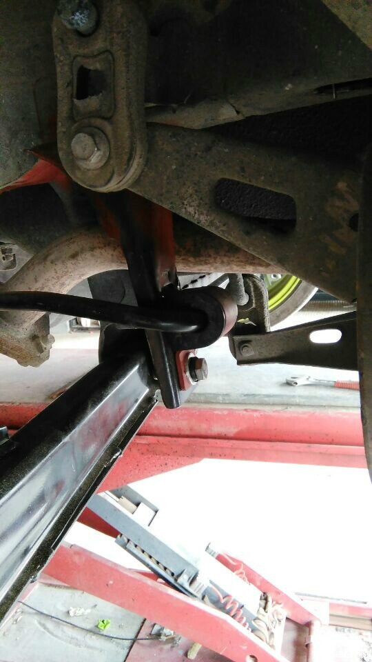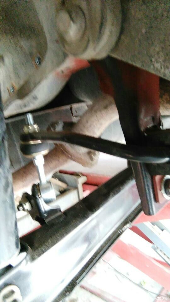 然后就是安装:开口胶支架用螺栓上到左右两个防倾杆支臂上(两边安装方向也是相反的);球头另一端上到下摆臂的吊耳上