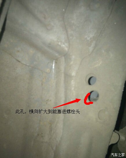 我的方法是把中间的孔扩大,让螺栓的头可以斜着塞进去,然后借助小铁丝将螺栓放到位(这个方法不需要另外开孔,尽量减少对车体的破坏,坏处是垫片比较大就没办法一起塞进去了,所以这个螺栓里面没有上垫片)