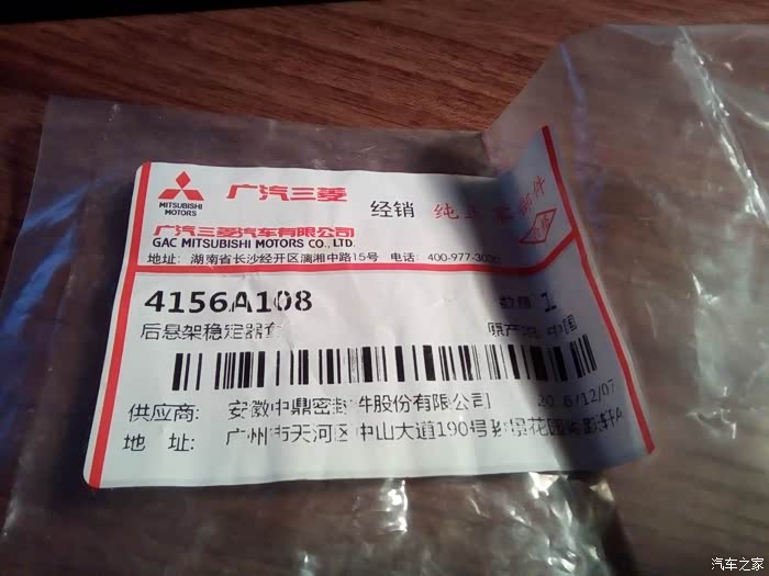 做为一名2013年老车主,好久没来了...目前行驶58000公里左右,主要是市区行驶。车辆行驶高低不平的修路地段时前面车底下异响,刚开始以为是前减震问题,后来咨询威海4S技术人员,给出答复是前悬架稳定器套的问题。于是联系广汽三菱公司索赔,更换后问题消失。不过更换后又发现后面也开始出现此问题,后面两个套件索赔进行中...注:前悬架稳定器套,编码4056A226,原产地:中国,供应商:安徽中鼎密封件股份有限公司 ,地址:广州市天河区中山大道190号