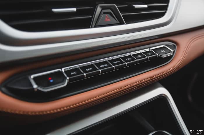 中控面板配以仿金属哑光拉丝装饰,而且在下方还有软性的皮制包裹,富有质感与高级的氛围。