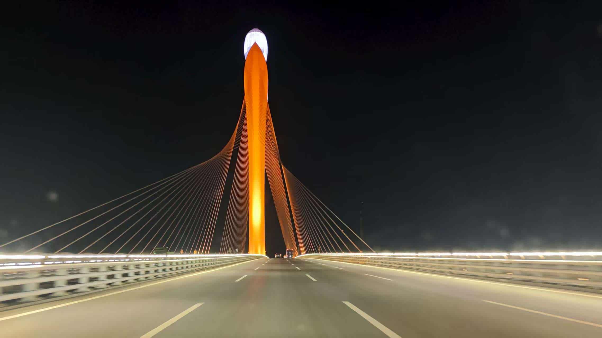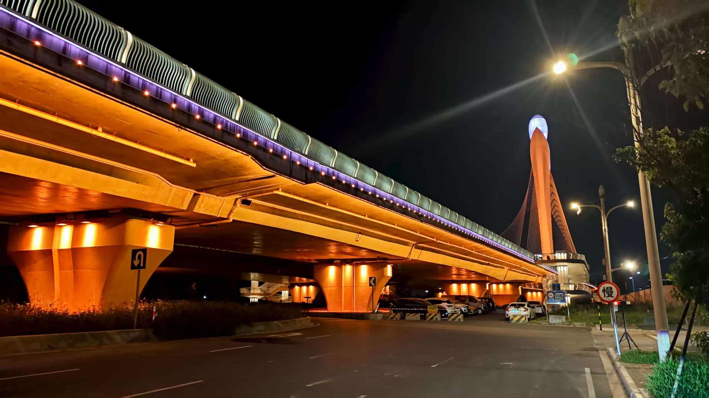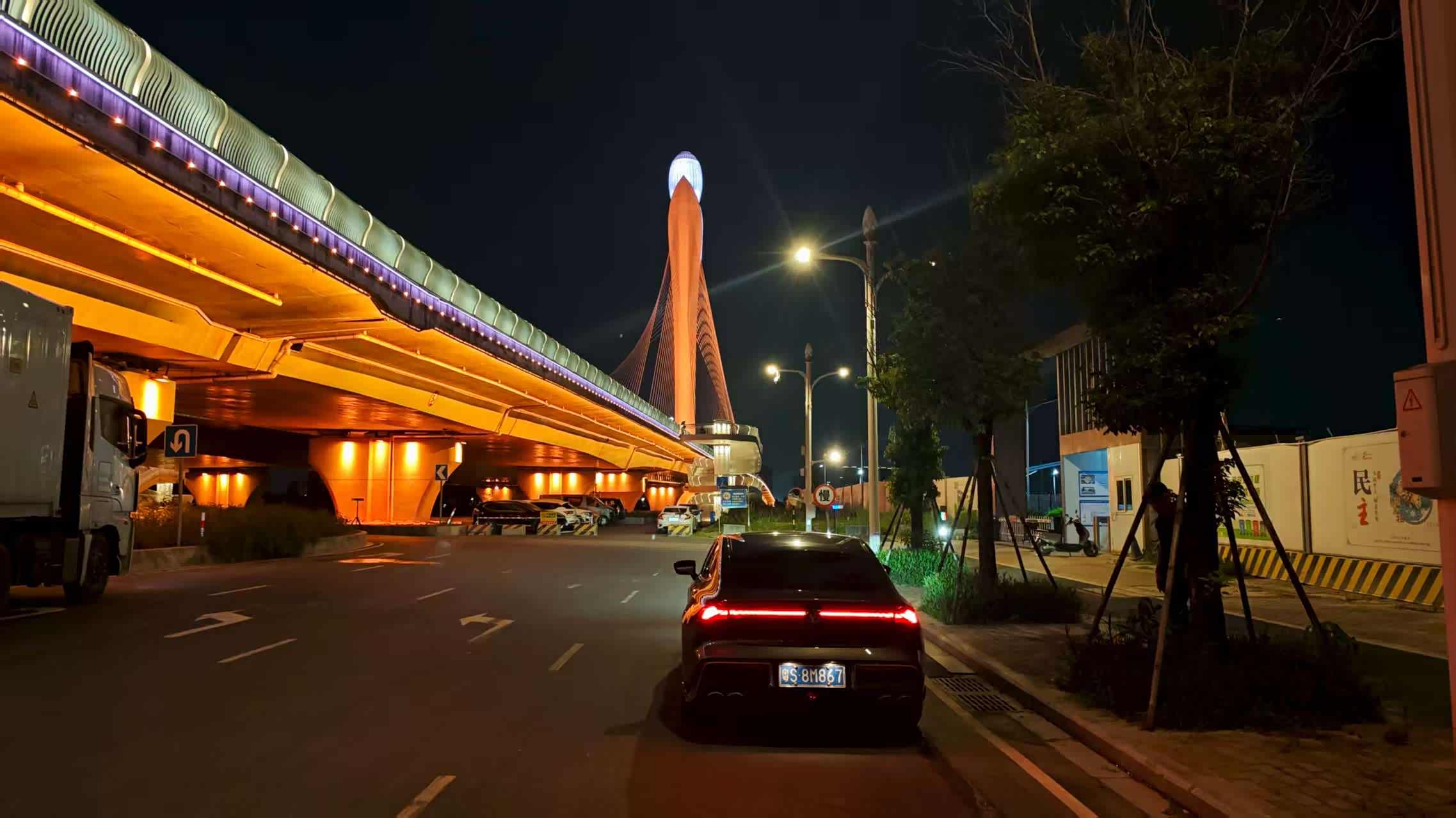 刚驶上引桥,远处的光点便逐渐织成光带。切换到运动模式,转速表指针轻快上扬,推背感带着车身平稳掠过弯道,桥身的轮廓在夜色中愈发清晰,斜拉索如银色琴弦,从两座贝壳状桥塔向两侧舒展,千万盏LED灯顺着钢索流淌,像被晚风拂动的星河。