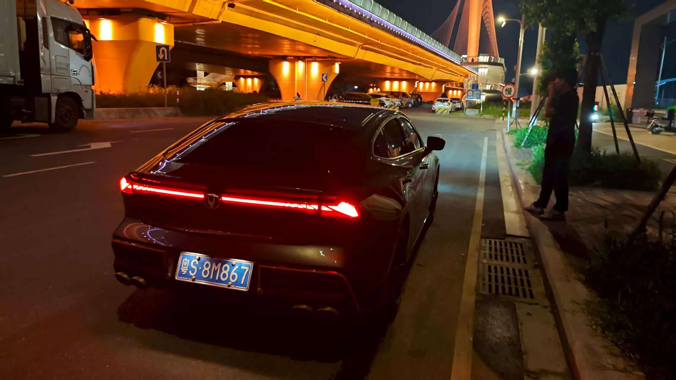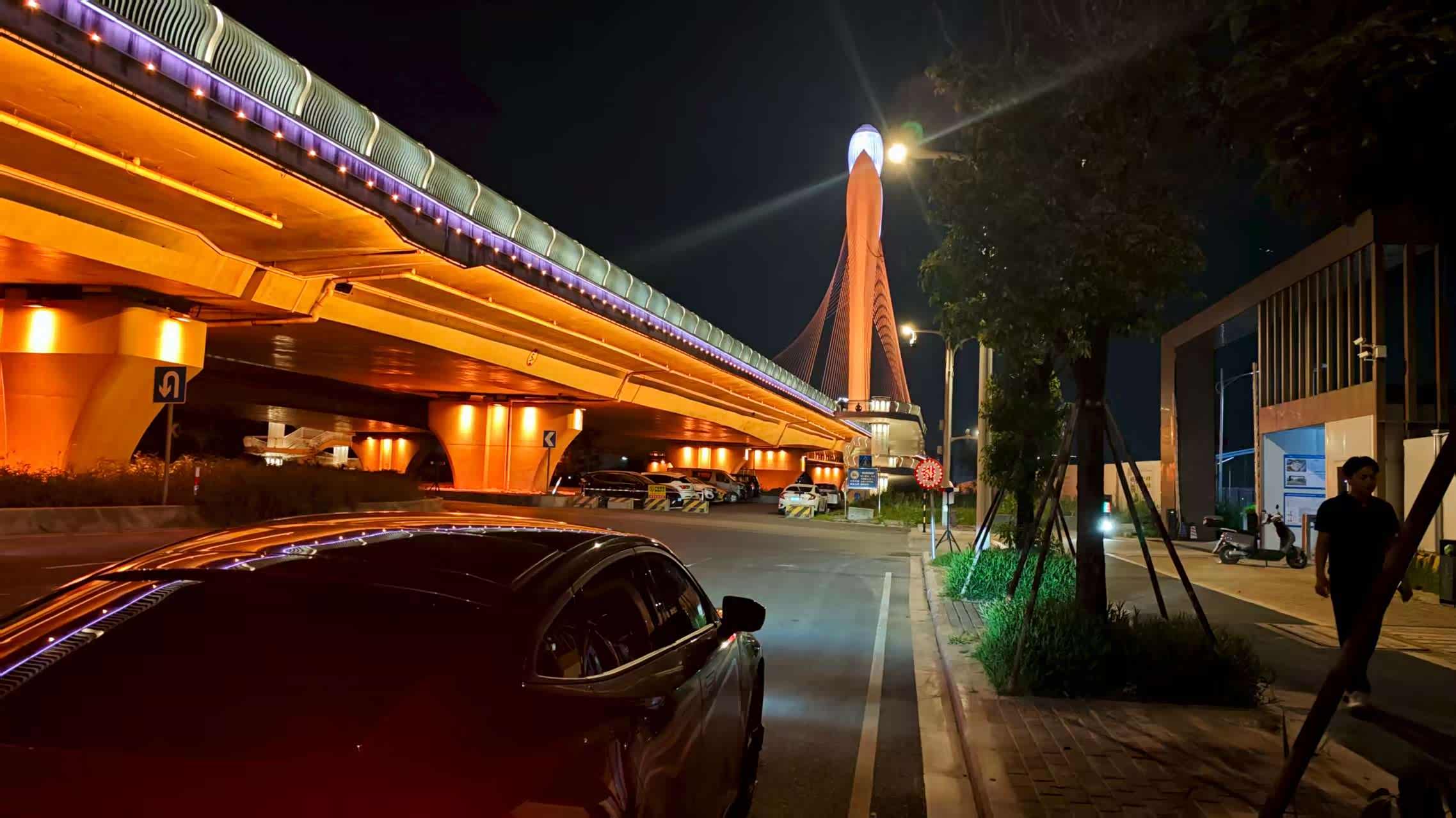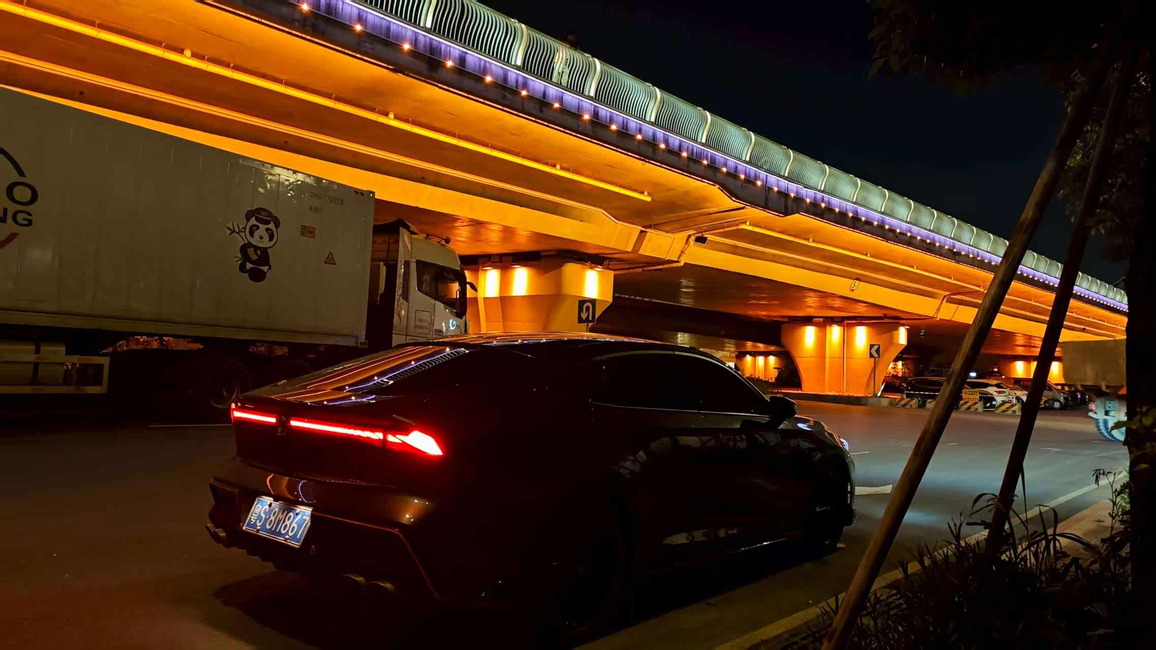停在桥下的路旁,拉好手刹的瞬间,整座桥突然在车窗上投下流动的光斑。下车时晚风带着海腥气扑来,回头看UNI-V的溜背线条,在桥灯映照下泛着金属冷光,尾翼微微上扬,像与这座未来感建筑隔空对话。车友诚不欺我,桥身的灯光会随时间变幻,有时是渐变的靛蓝,像将夜空揉碎在了海面;有时又转成暖橙,与远处货轮的航标灯呼应成一片温柔。