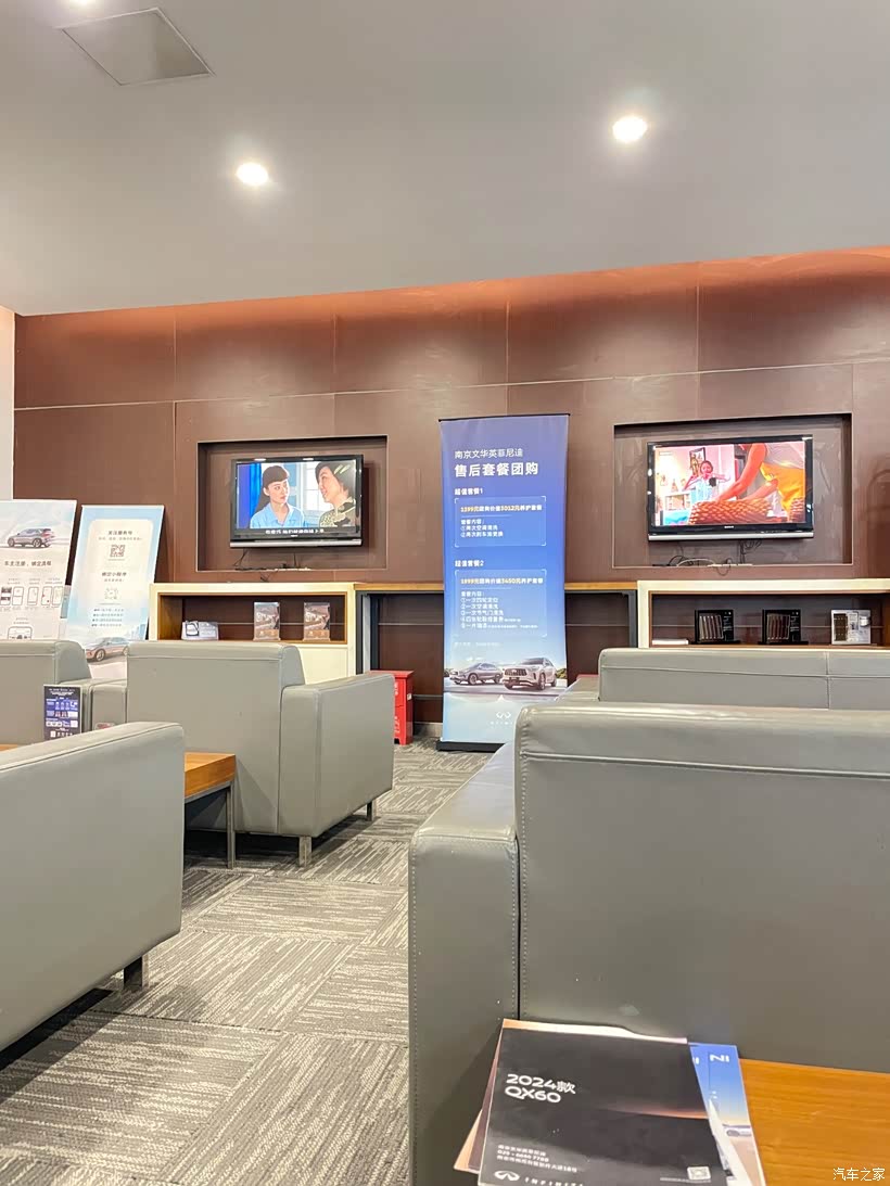 这几天正好有空,准备赶着年前把车保养做了,于是在APP上预约了周三10:30去4S店。当天我准时来到了4S店,工作日的4S店真的很清闲啊,车间里只有3台车,只有上一代的QX60 2.5混动的在架子上施工。休息区里一个人也没有,偌大的店怎么维持啊!