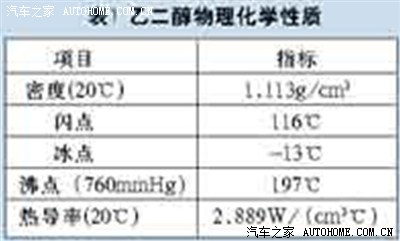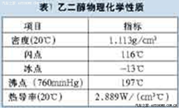 防冻剂是防冻液的主要成分,有效的防冻剂是各种有机醇。各国从上世纪50年代以来几乎全部采用乙二醇作为防冻剂。乙二醇是一种无色、透明、稍有甜味和具有吸湿性的粘稠液体,它能以任何比例与水相溶。乙二醇的物理化学性质如表1所示。