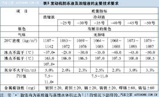 我国目前执行的是SH0521-1999《乙二醇型发动机冷却液及其浓缩液》。是参照ASTMD3306标准制订的,该标准所属产品分为浓缩液和冷却液两类,冷却液按冰点分为-25号、-30号、-35号、-40号、-45号和-50号等6个牌号。其主要技术指标见表3。