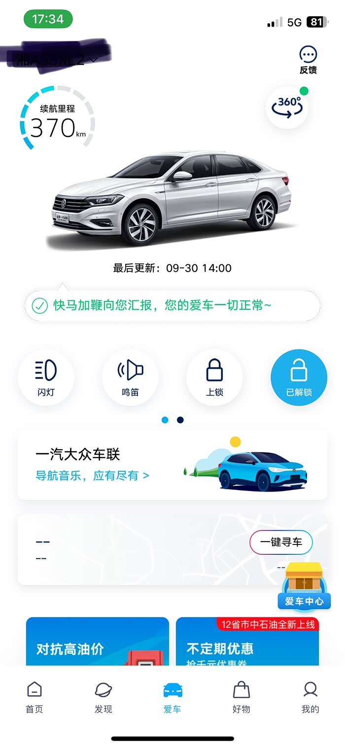 正常是送5年的基础控车功能,你可以试一下退出重新登陆,不过大众的APP聊胜于无吧,更新不及时,用处并不大,还需进一步完善加强。