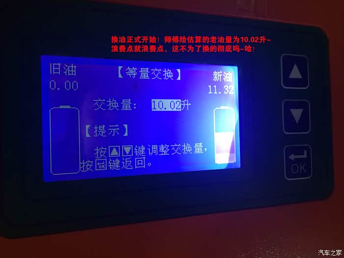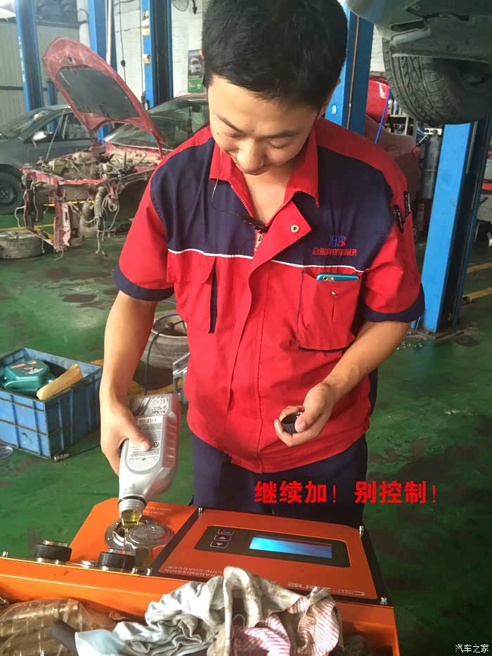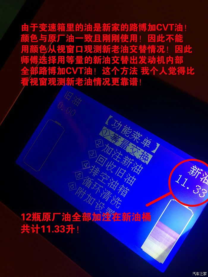 转过头他问我你是放油加新油,还是用循环机彻底走一遍全换成新油?我问哪个换完最妥当?他说那肯定是循环机换完最好,里面没有老油全是新油~但是就是废点,你要是加新油6-7瓶够了,要是循环机换的话~最起码得买12个!听完这个我郁闷了,自己给自己心里找病!那就用循环机换吧~160/瓶(4S要330,还是合适多了),总共买了12瓶,花了1920元,外加之前买路得加的钱700,里外里花了2620元!4S保养是2500左右(但是不是用循环机给你换,是放一部分老油加进去6瓶新油),这么看,还是划算!