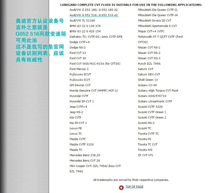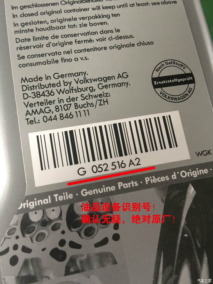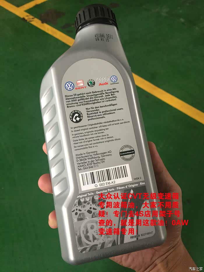 但是换油的第二天,我们从天津去北戴河玩,我没开让媳妇开的!~媳妇跟我说,怎么感觉你这车保养完了开起来那么肉呢?(天津话,就是没劲)于是到服务区,换我开,我仔细开了开,没有她说的那么严重,多半是心里作用造成的(但是与我以前开车的状况比起来,是有那么一点点的肉)但是我对于所加变速箱油的标号,还是完全放心的!毕竟设备识别号:G 052 516 A2 大字在路博加的官网上写着了!但是这人啊,就怕吓唬,这一吓唬就嘀咕,越嘀咕越坏事!于是我决定等从北戴河玩完回来去4S问问平时关系不错的师傅!
